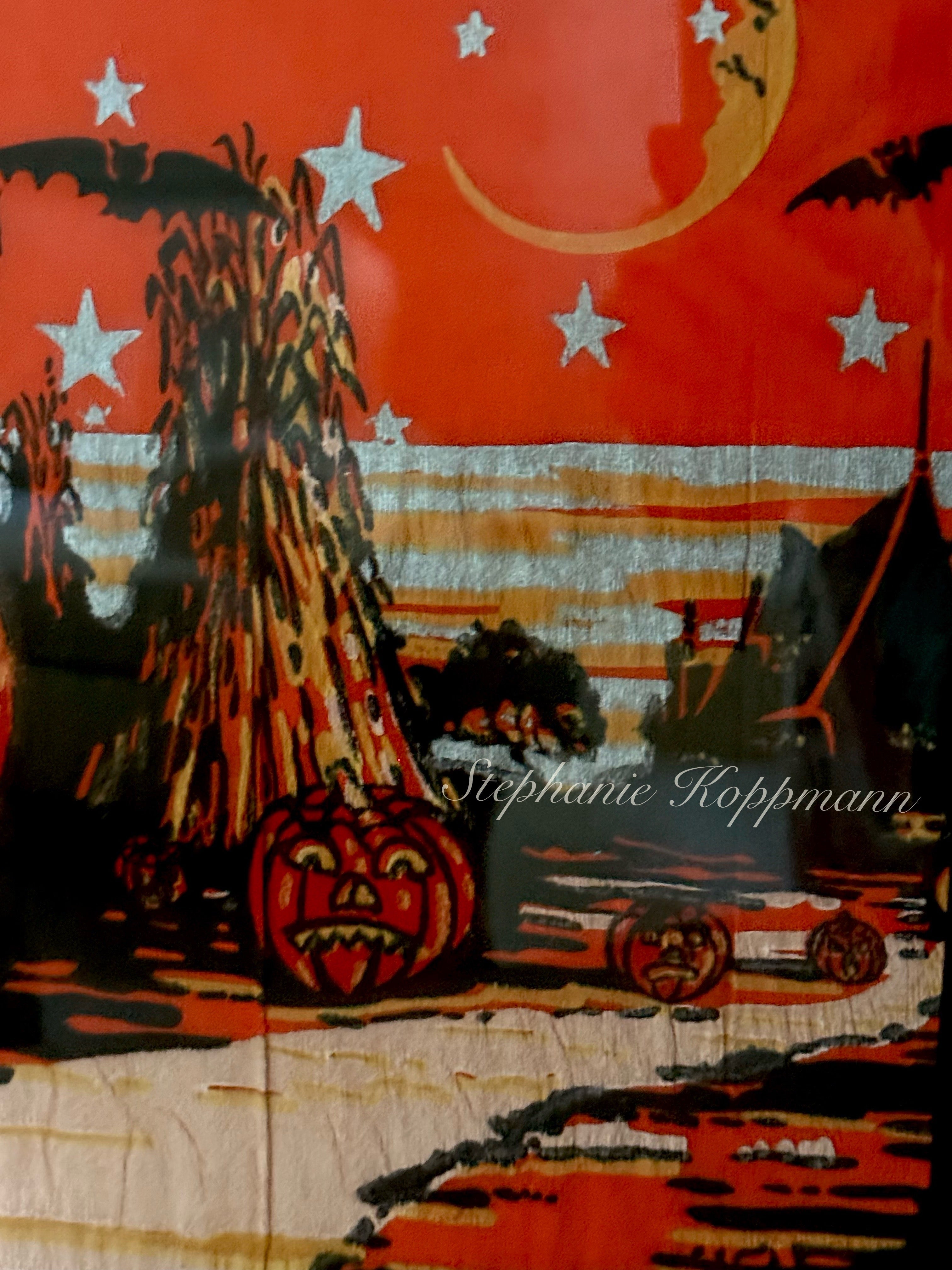 An enchanting antique crepe paper artwork produced by the Dennison Manufacturing Company, renowned for its early 1900s holiday and party decorations. This vivid Halloween design features a cheerful jack-o’-lantern landscape under a star-filled sky, complete with soaring witches, flying bats, and arched black cats. While a straw bonfire lights up the sky. The lively orange-red background and whimsical detailing embody the festive imagination and charm of Dennison’s golden era of design.