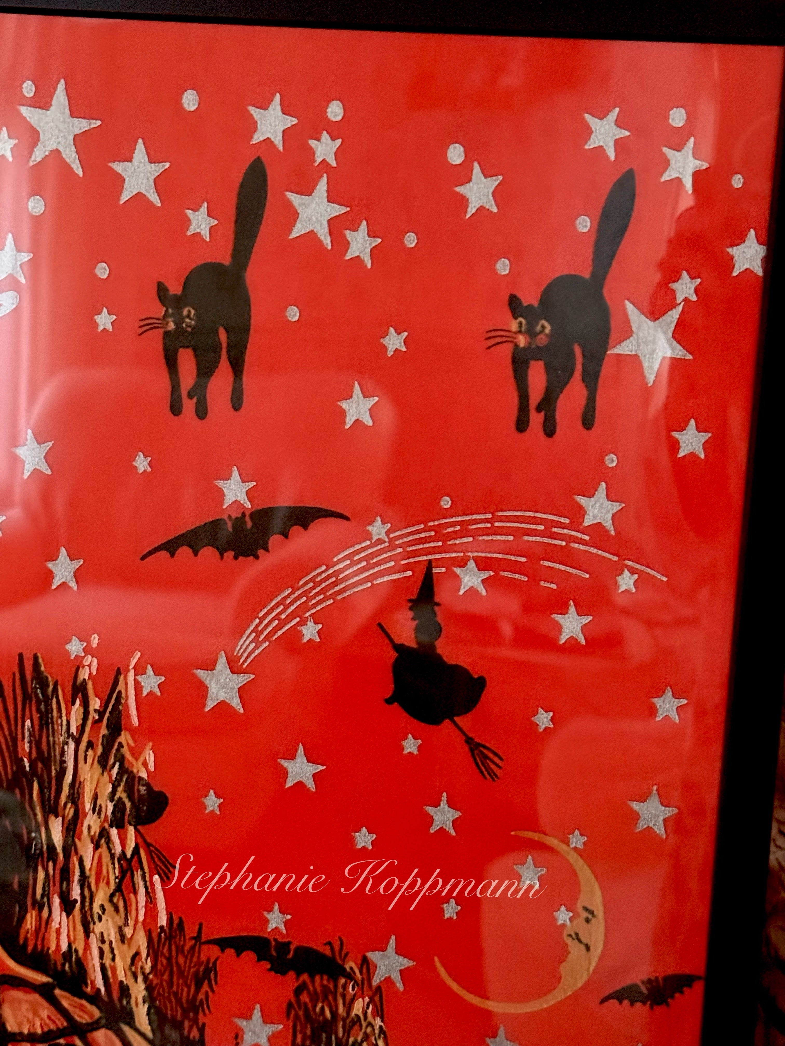Framed and matted under high pressure polycarbonate plexiglass. This piece preserves the original crepe’s texture and saturated color while presenting it as a fine decorative display. A rare and beautifully composed example of Dennison’s early seasonal artistry—capturing the wonder and nostalgia of vintage Halloween at its finest.