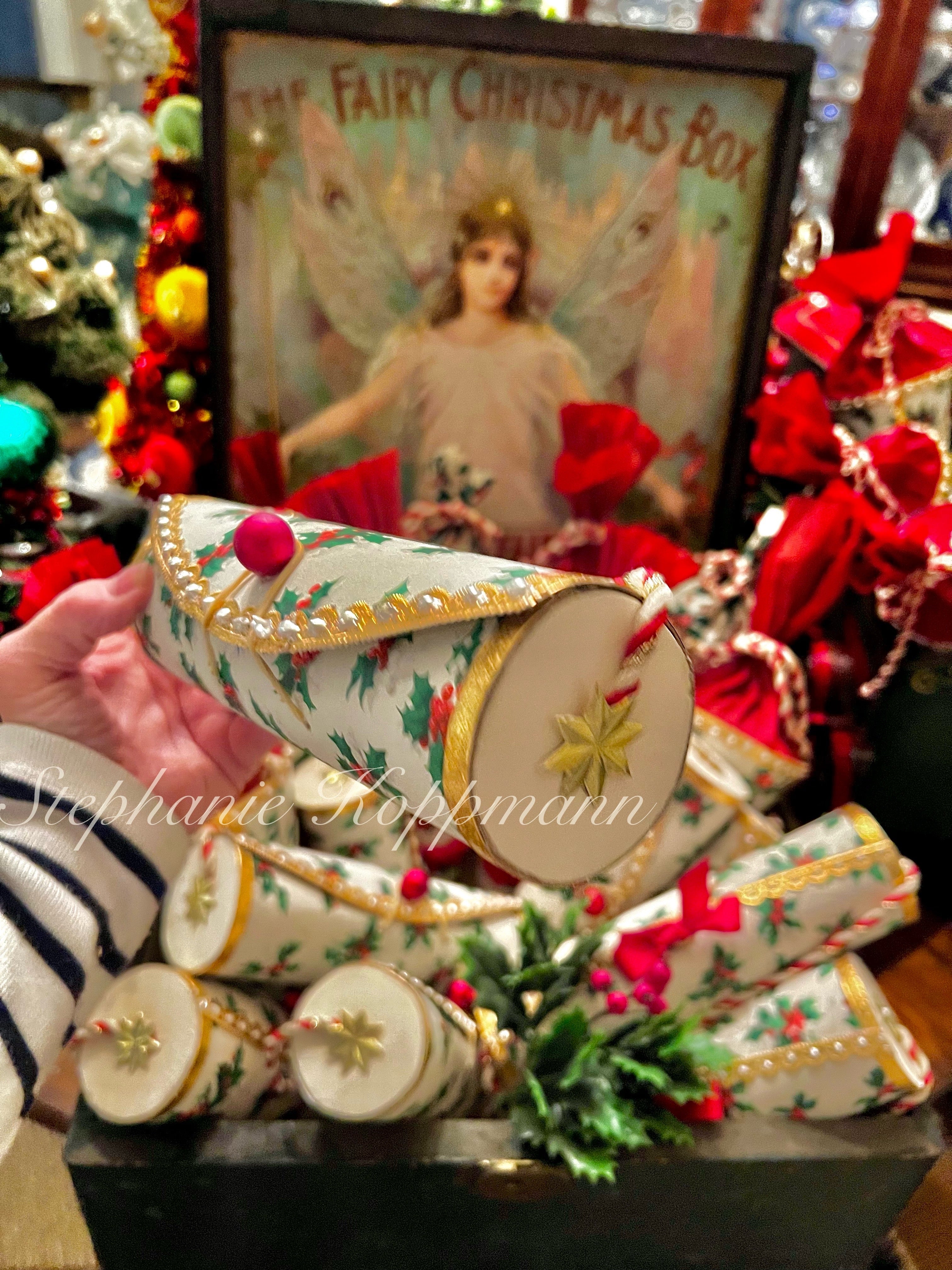 These beautiful 11” containers are made from 1930s Christmas Holly Paper. Decorated with gold Dresden trim, pearls and festive Aspen ribbon. They measure 11” x 3”. Super darling and so so very festive for the Holidays!