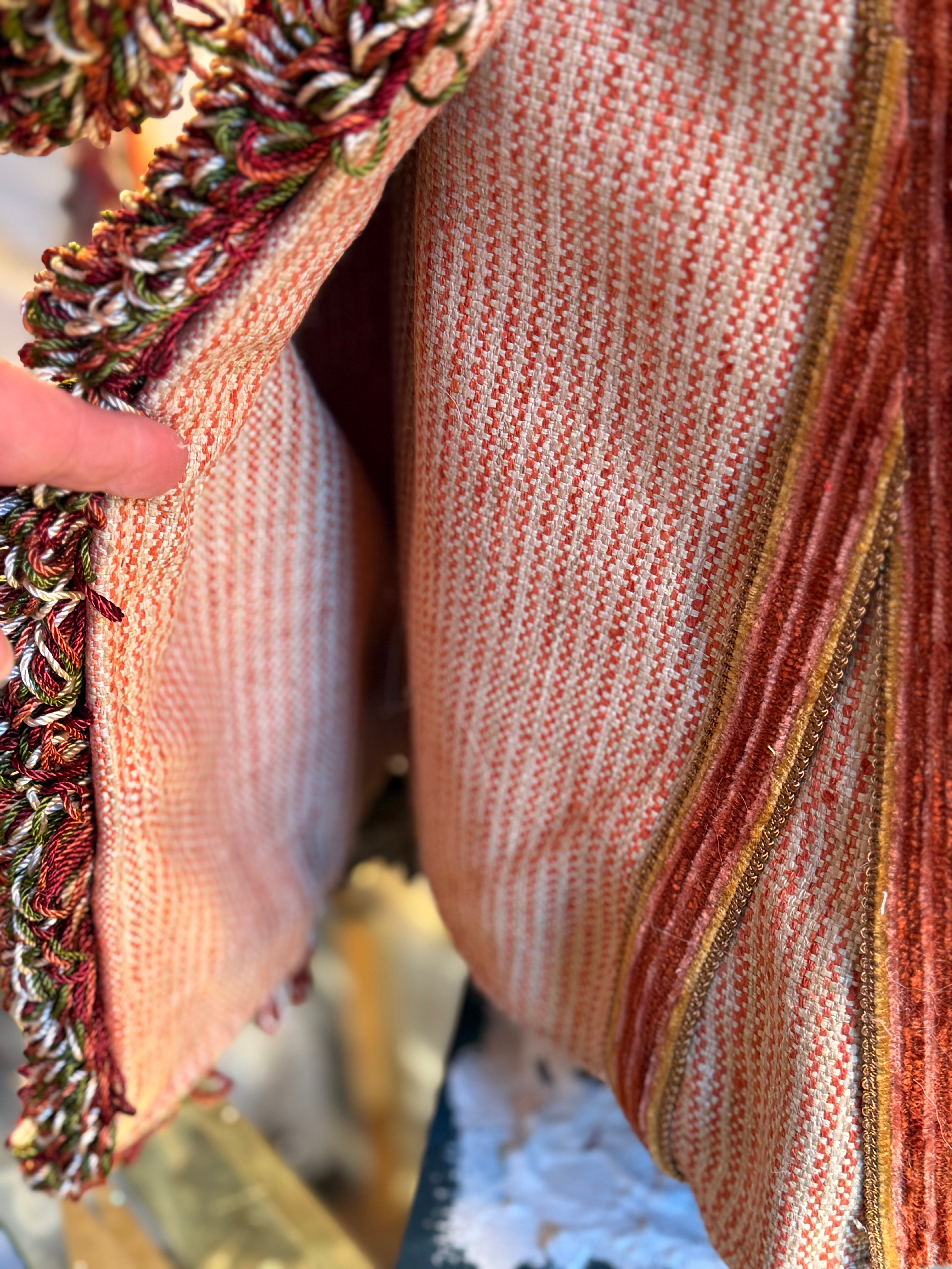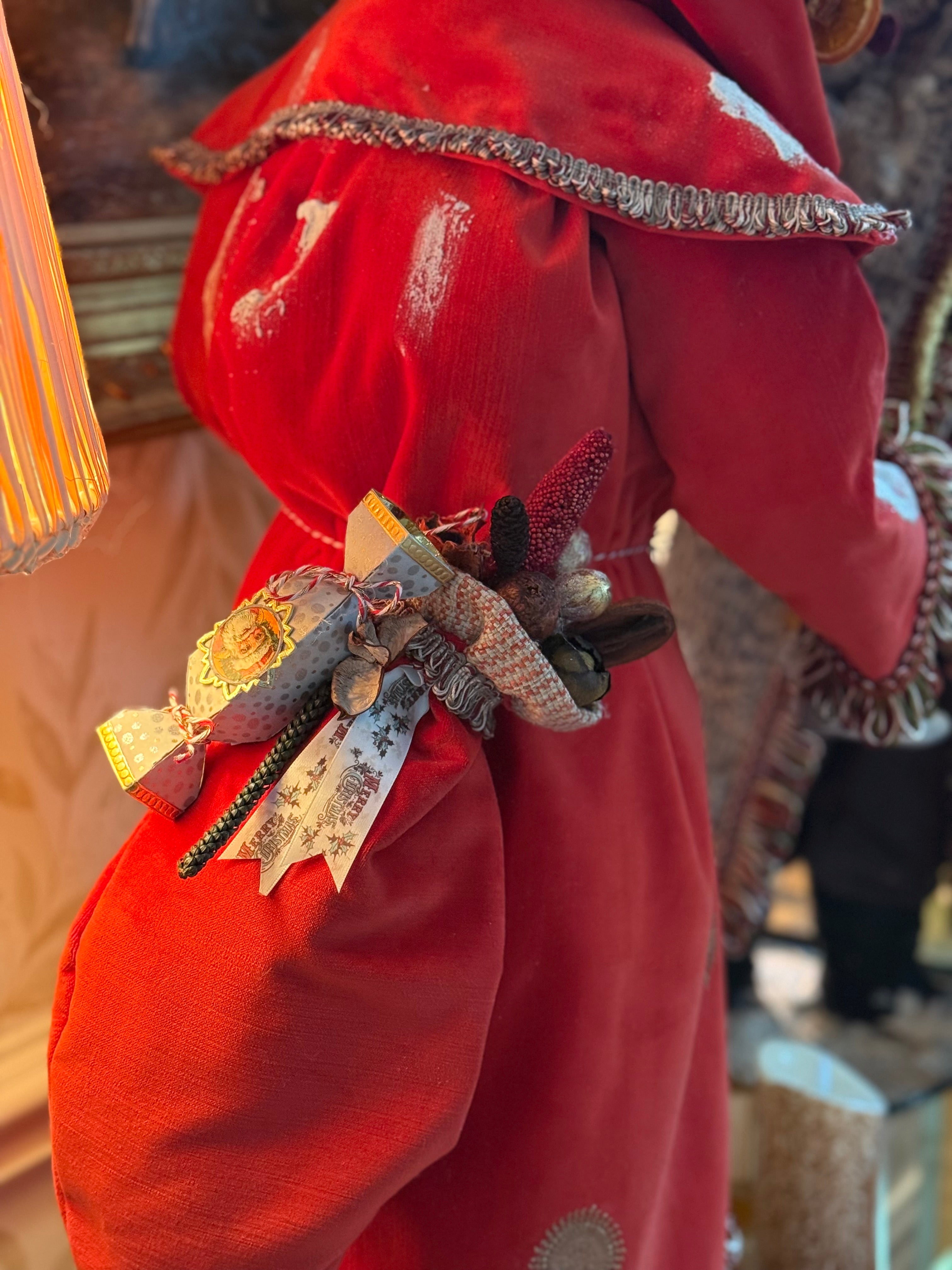 40” handmade Santa. Luxurious velvets, double lined cloak and the richest of trimmings. Faces and hands are all original handmade and one of a kind. He brings fruits, nuts and coins to good little children.