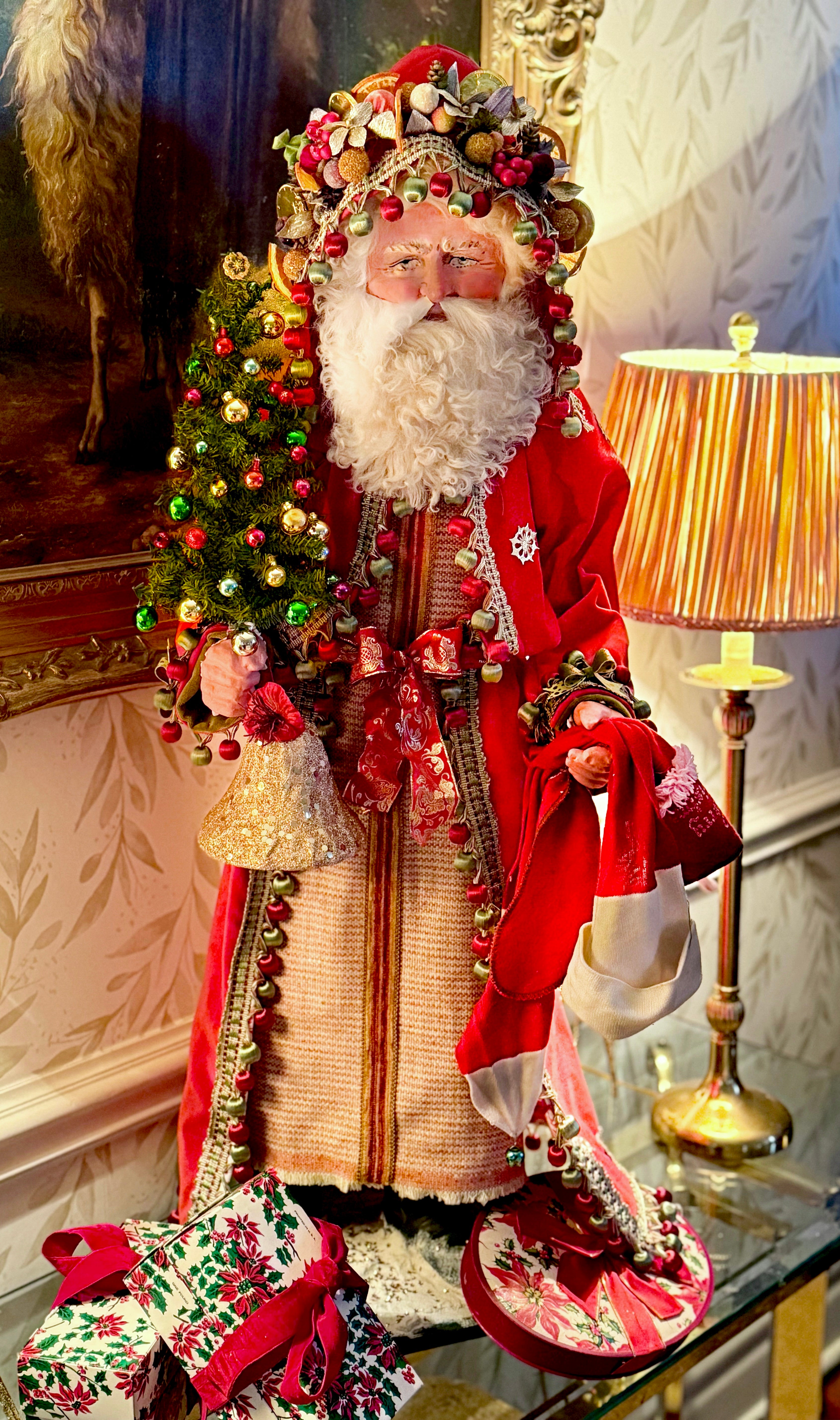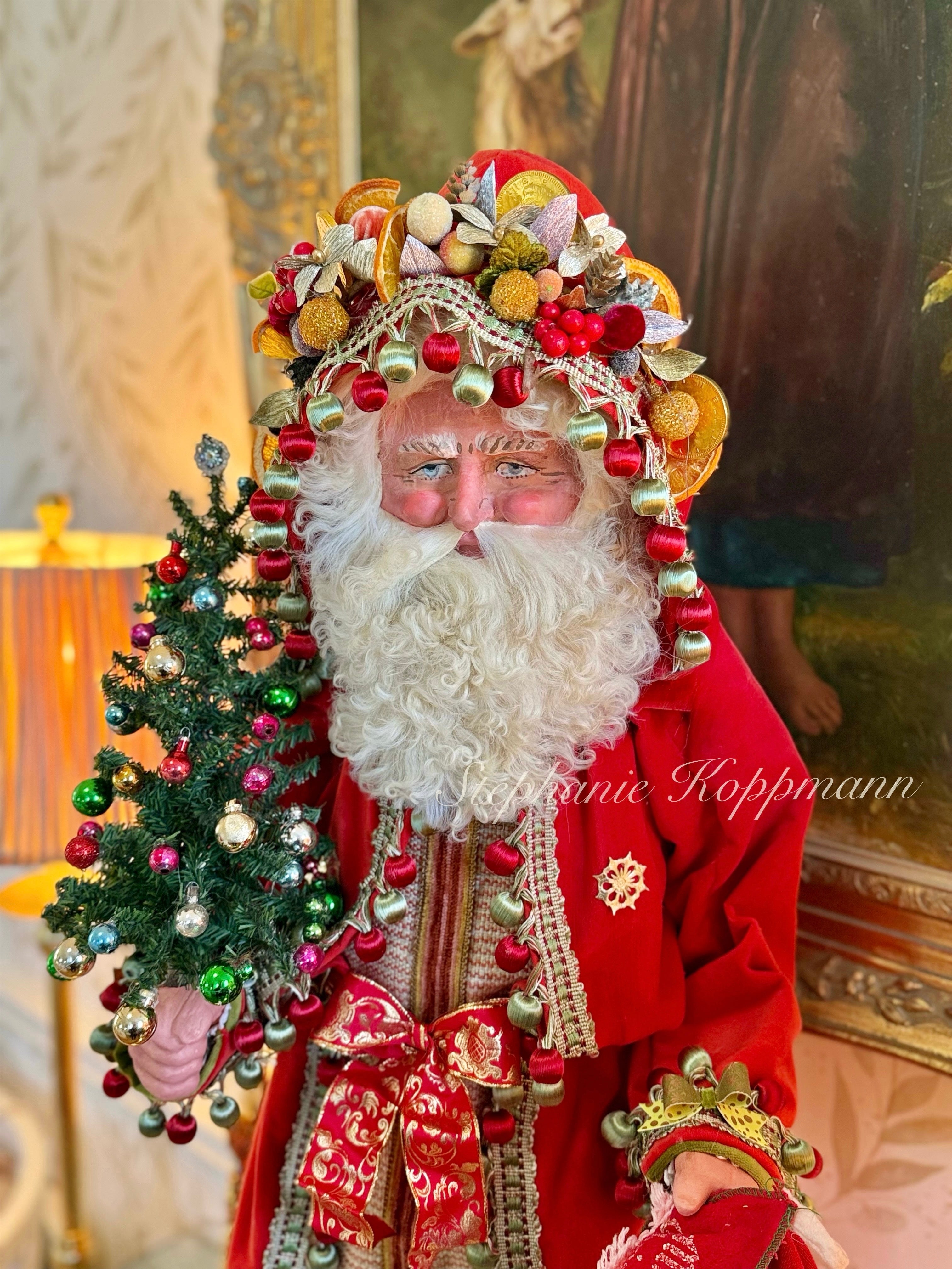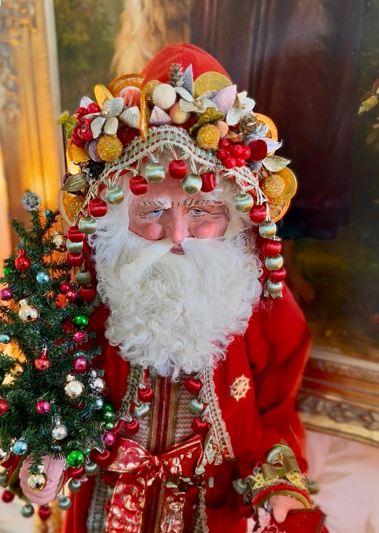 40” handmade Santa. Luxurious velvets, double lined cloak and the richest of trimmings. Faces and hands are all original handmade and one of a kind. He brings fruits, nuts and coins to good little children. Woolf pants under a silk wool tweed cloak. Red velvet outer heavy lined coat with luxurious silk trimmings. Dresden stars cover his coat.