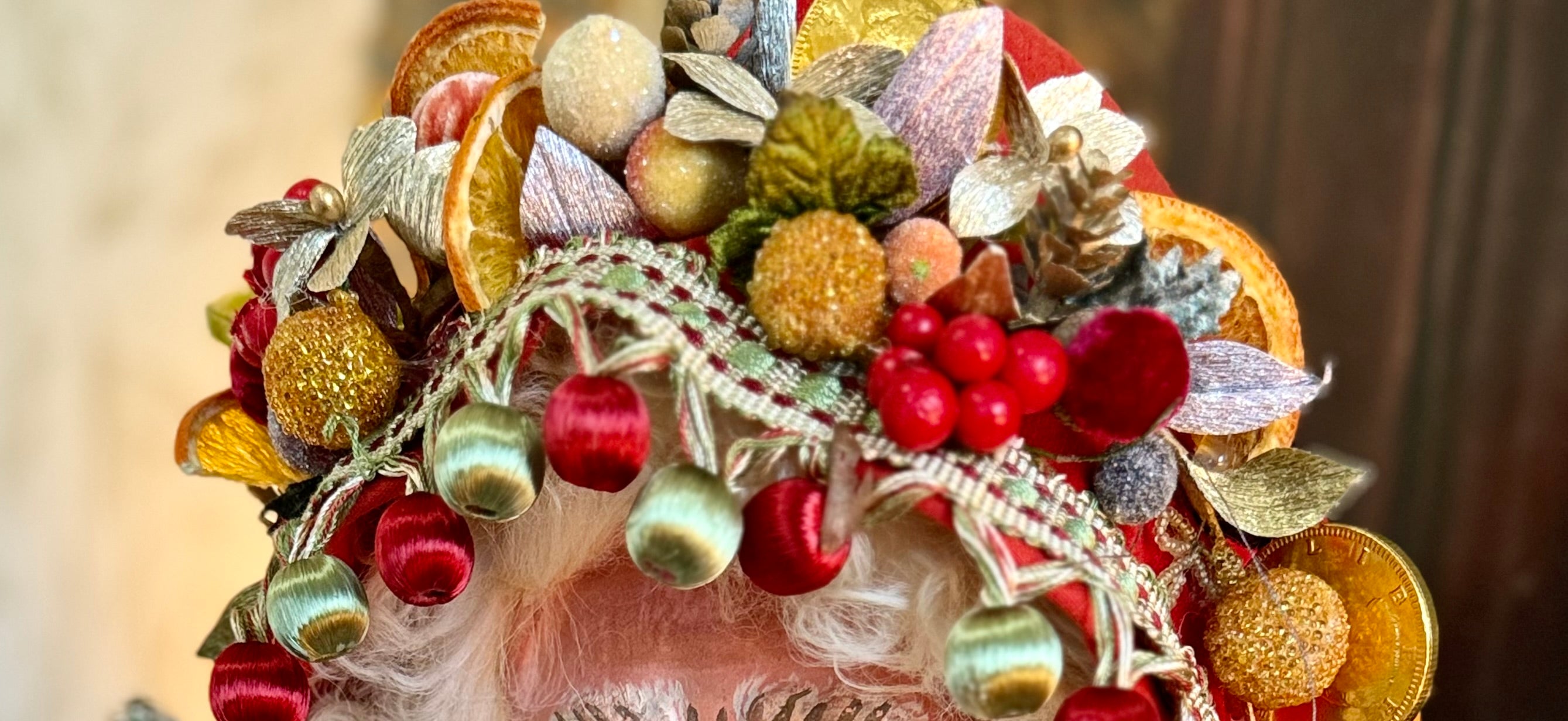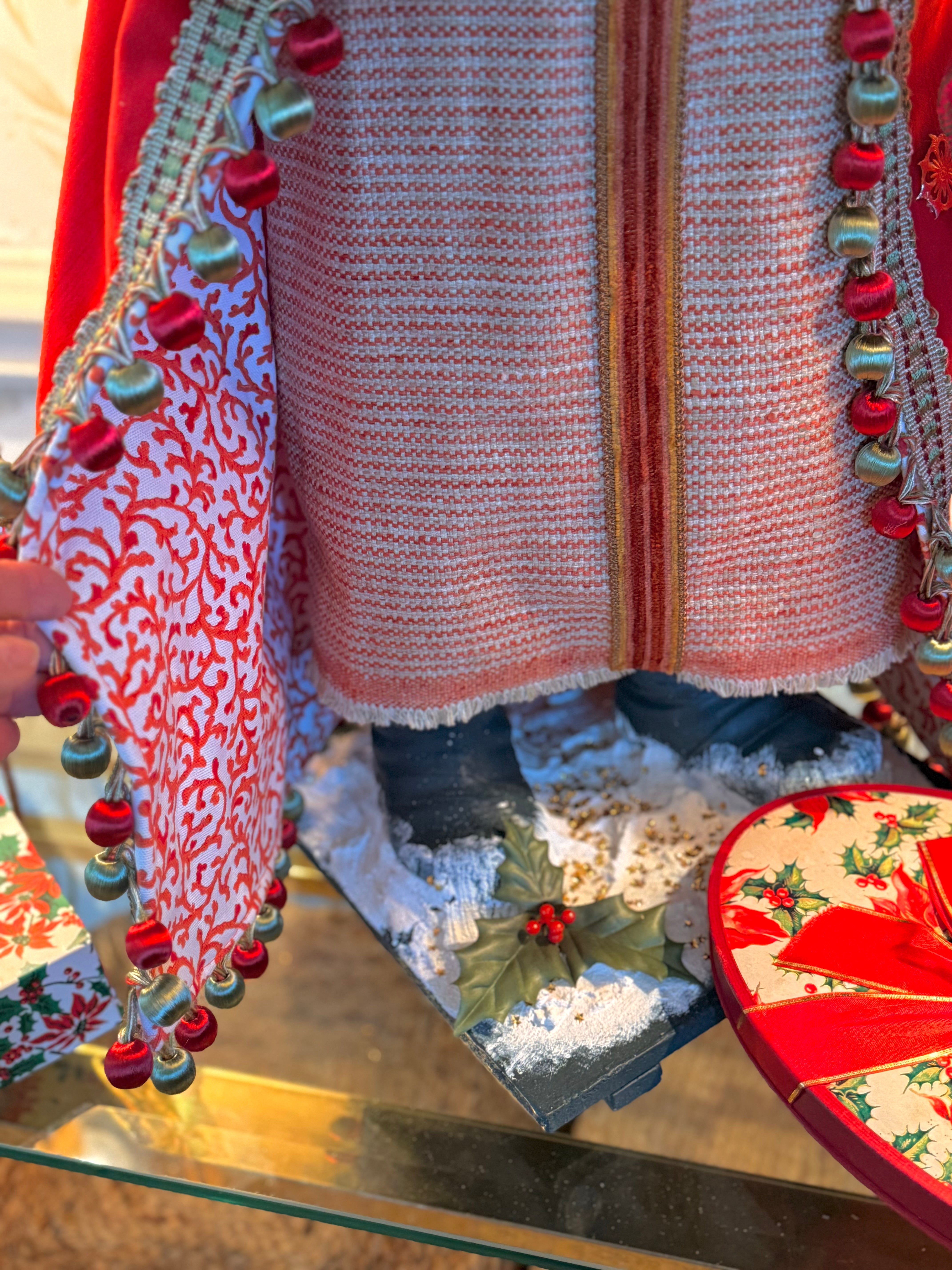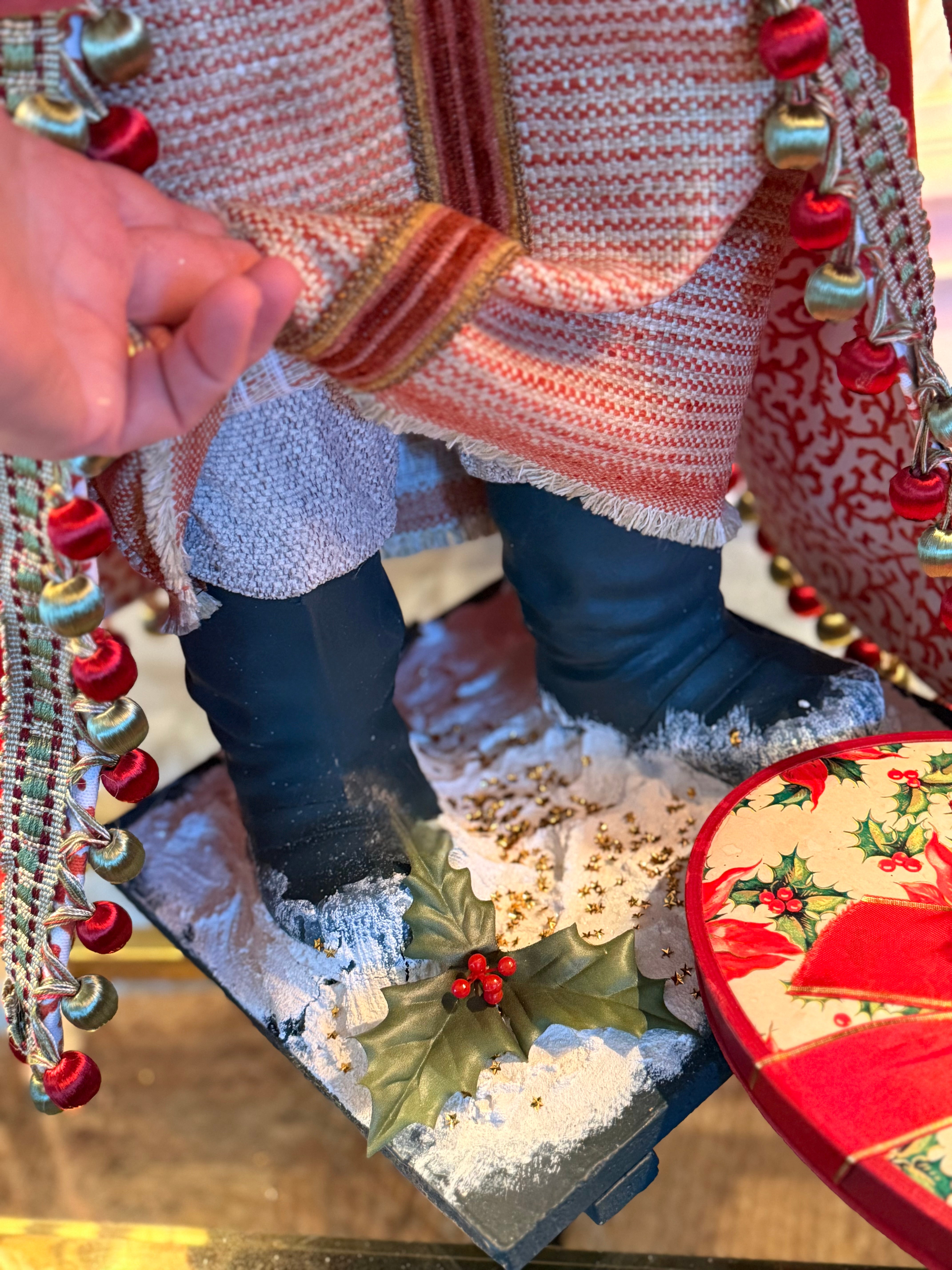 40” handmade Santa. Luxurious velvets, double lined cloak and the richest of trimmings. Faces and hands are all original handmade and one of a kind. He brings fruits, nuts and coins to good little children. Woolf pants under a silk wool tweed cloak. Red velvet outer heavy lined coat with luxurious silk trimmings. Dresden stars cover his coat.
