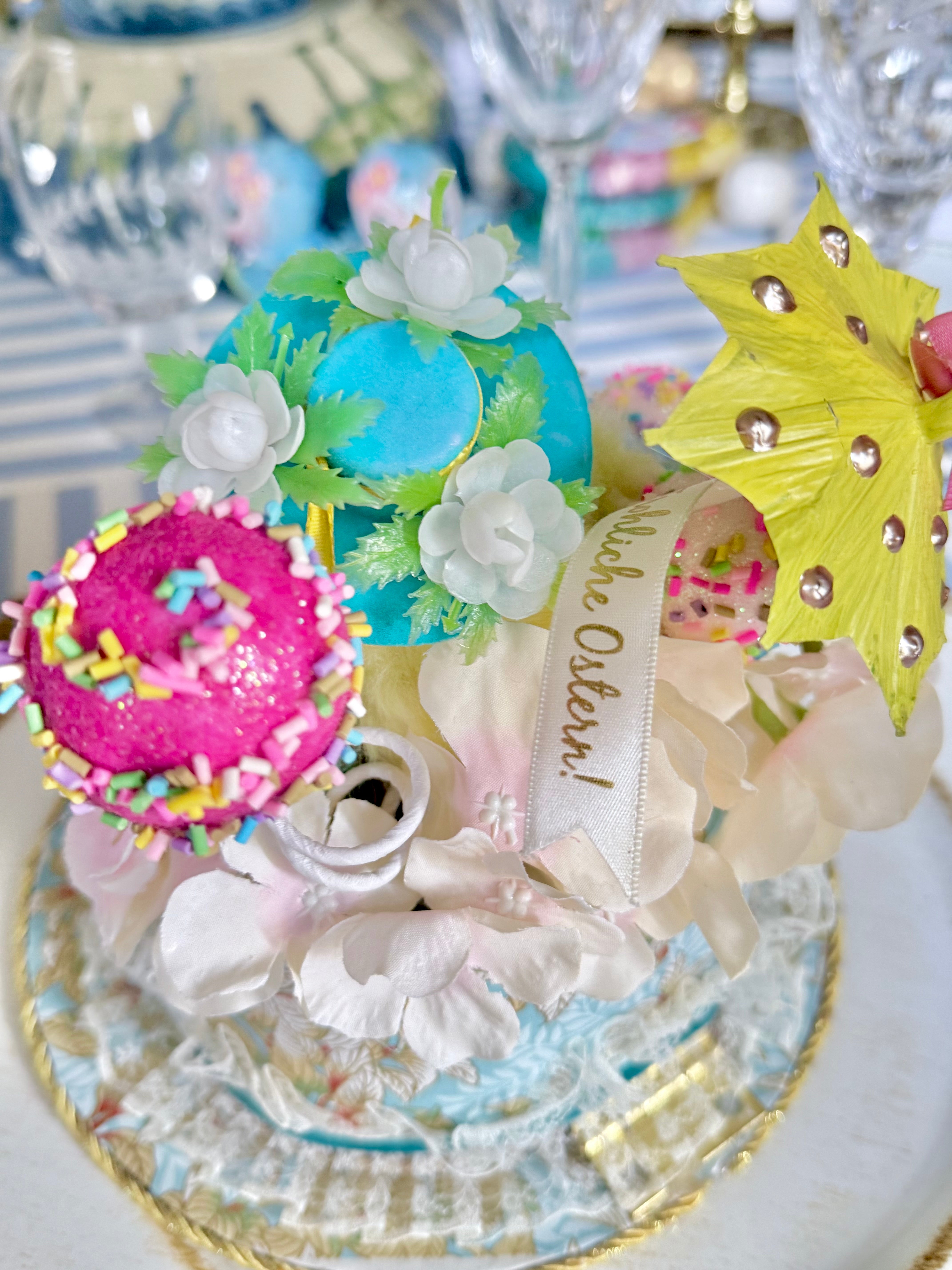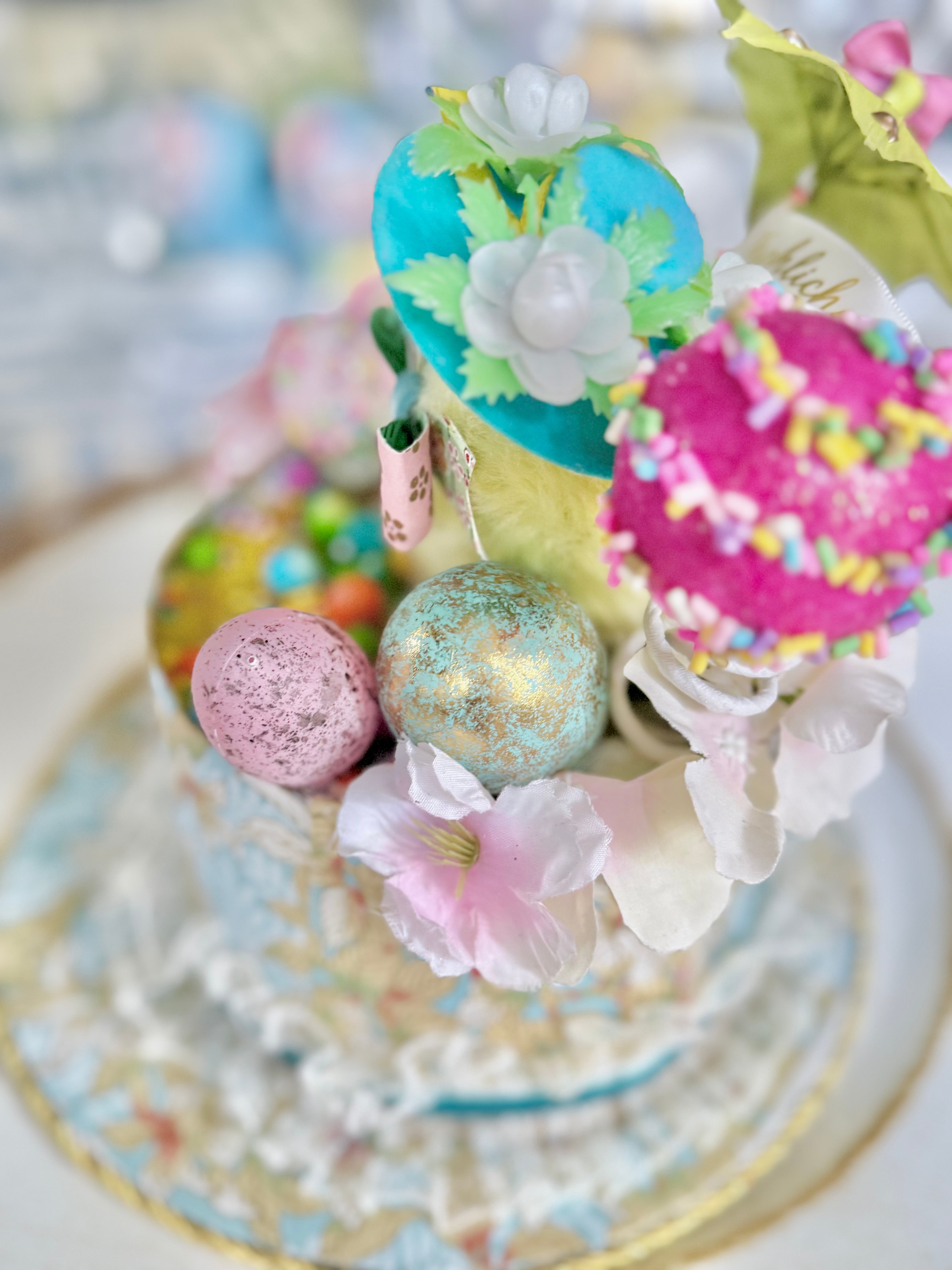 Made with vintage Easter supples and furry chicks, ducks and porcelain vintage rabbits. Each colorful hat comes dressed in an array of bright colors and styles, adorned with unique patterns and delightful VINTAGE Easter toppings. They are designed to fit nestled onto your dining table plates, adding a dash of charm to every setting.