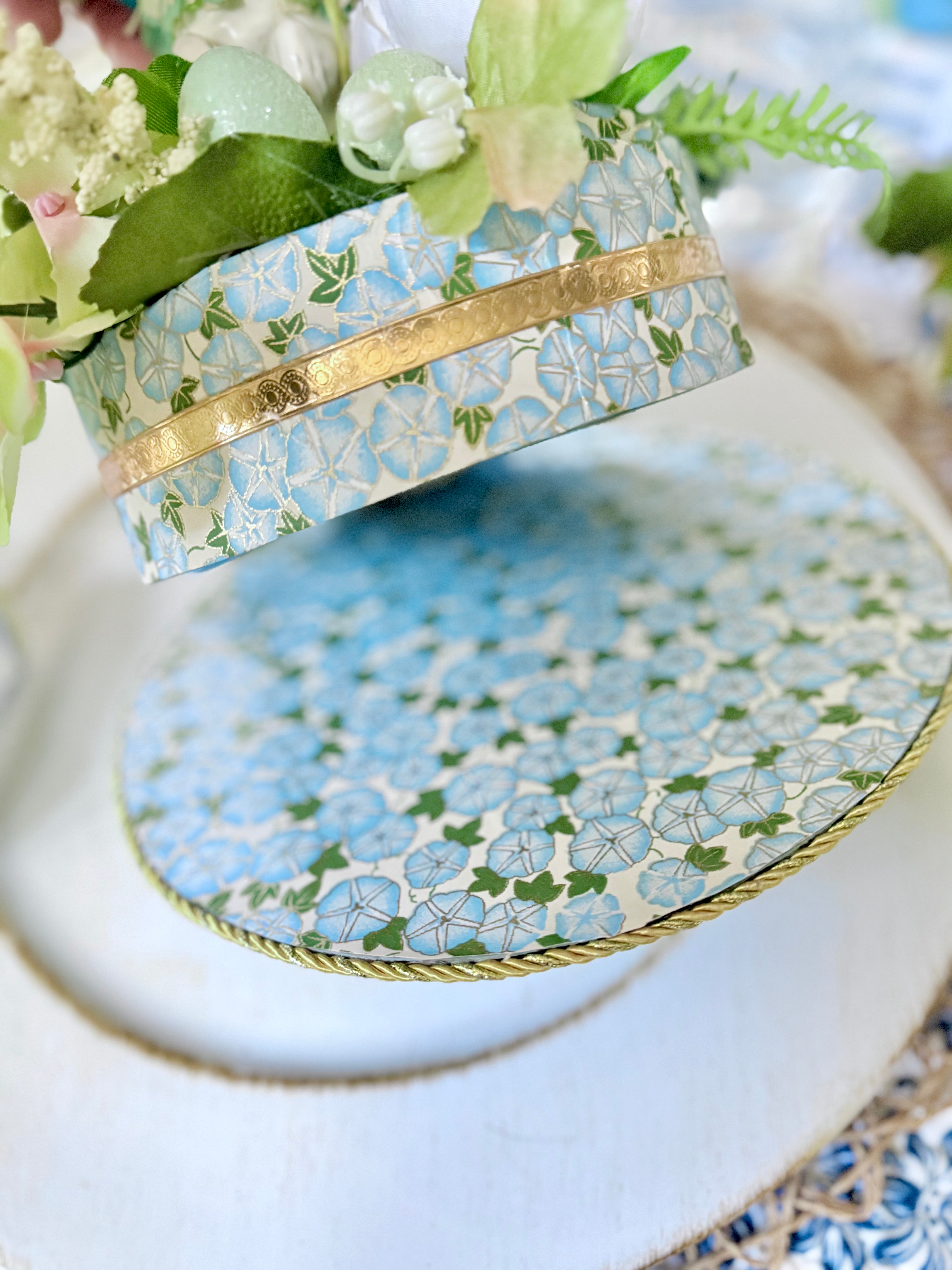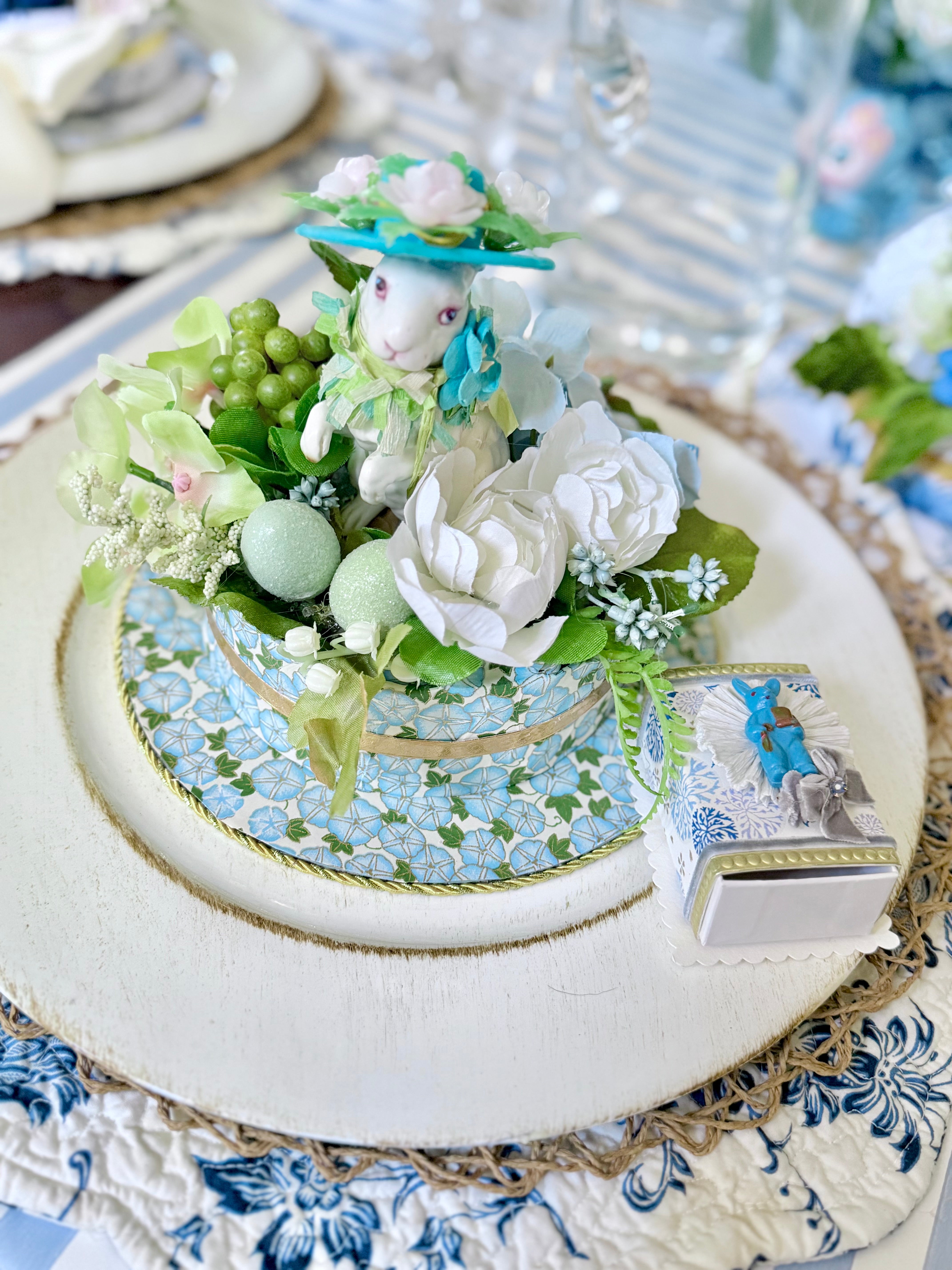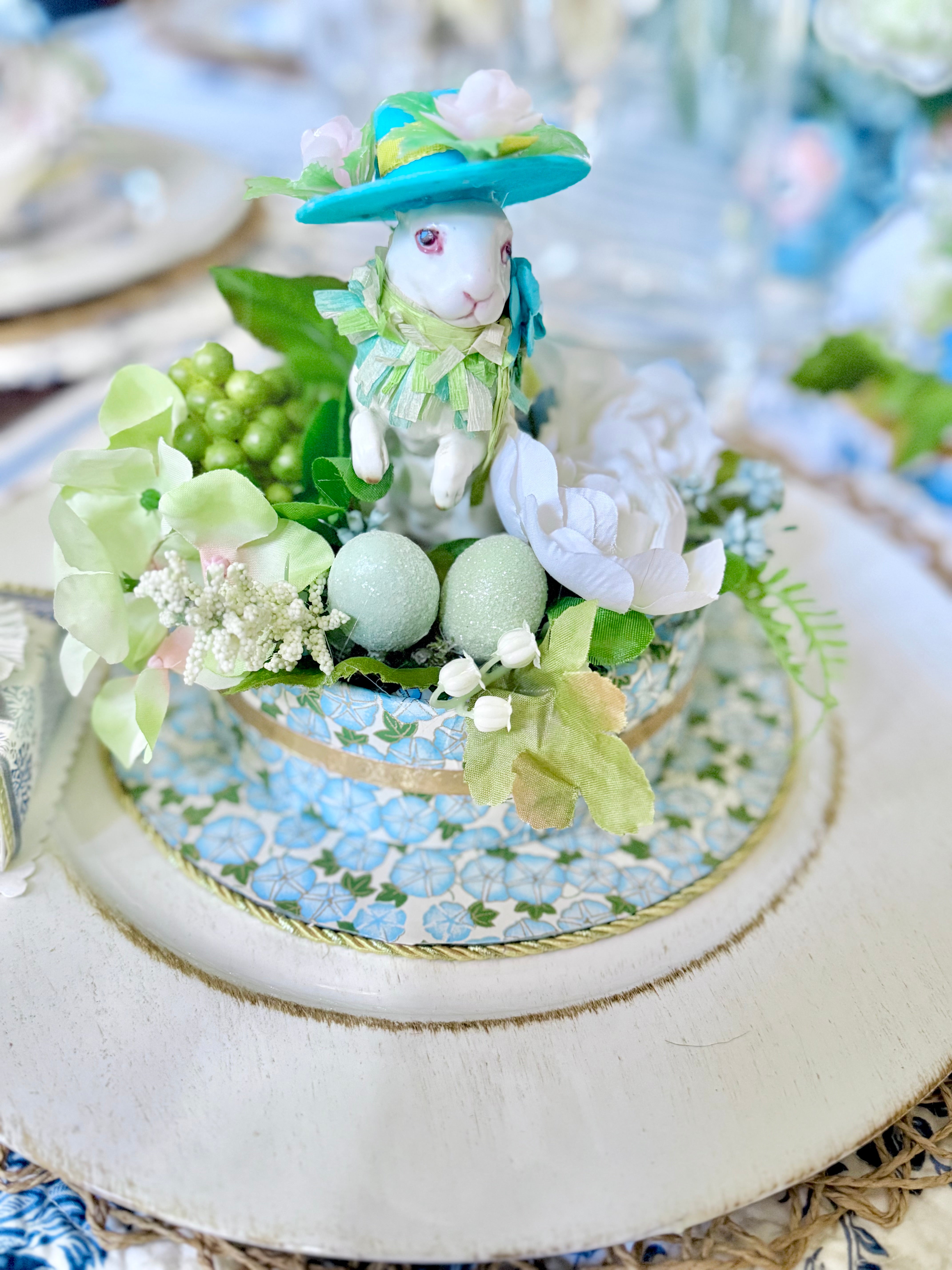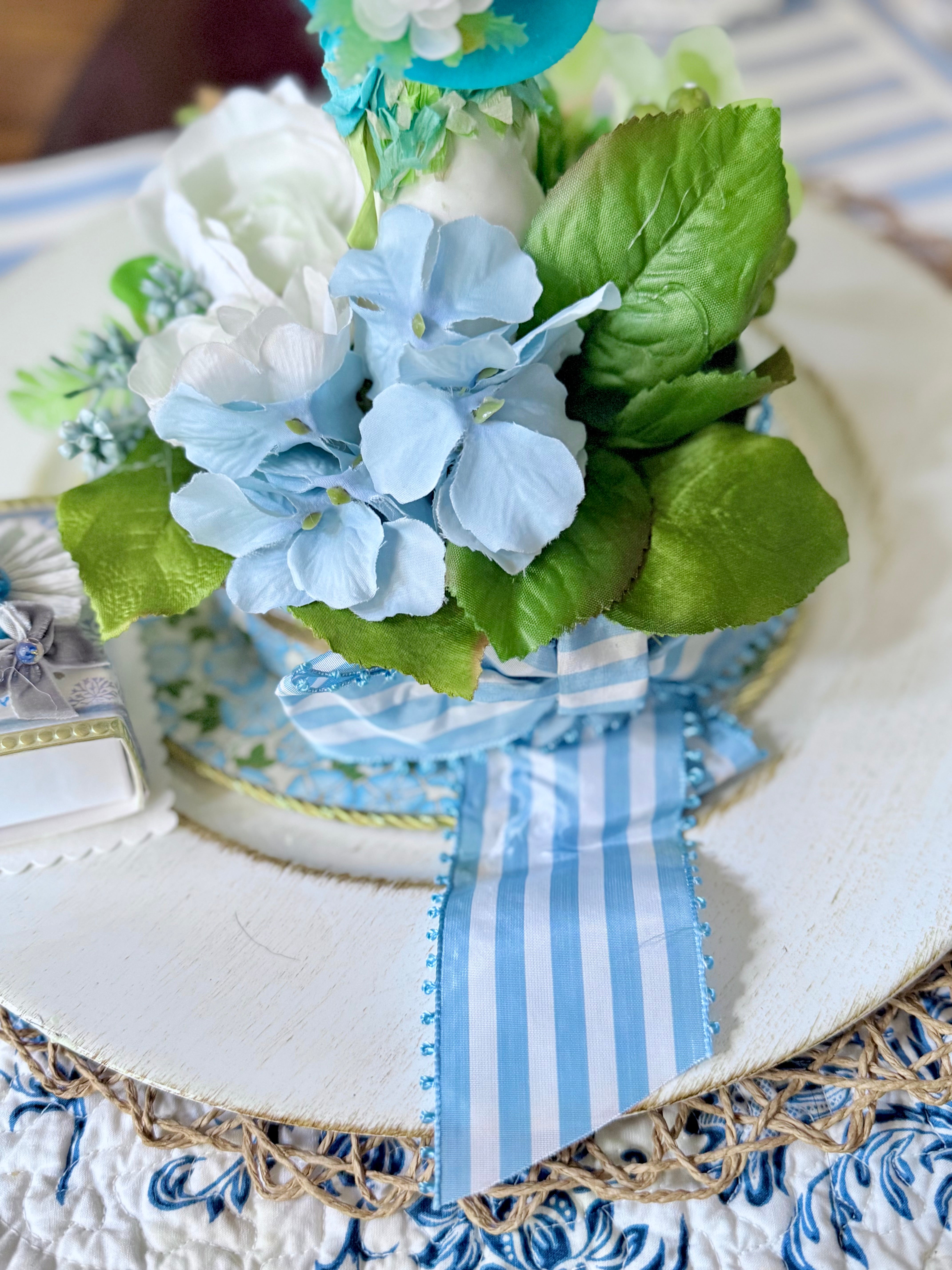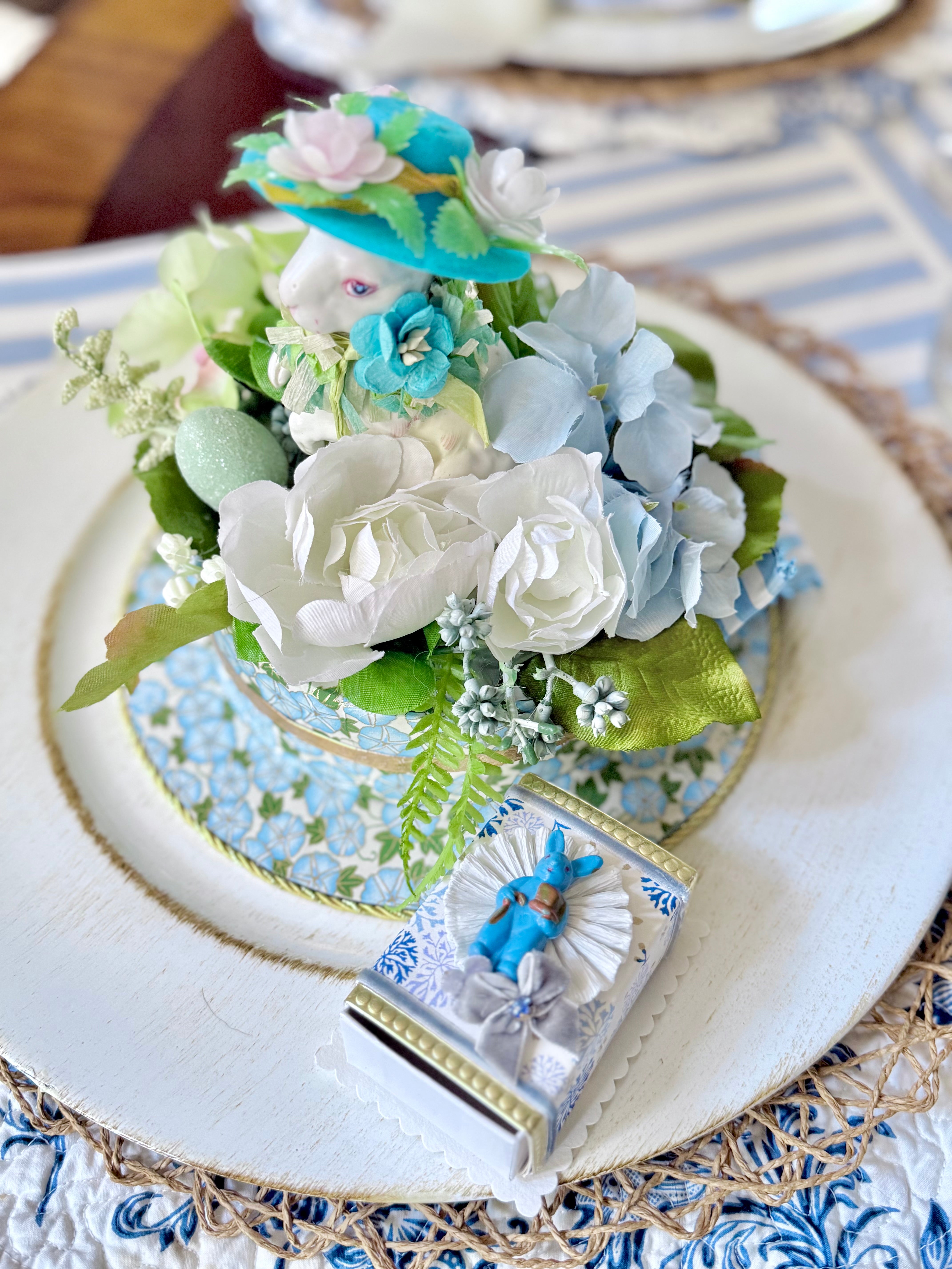 New aqua Blue/Chinoiserie Easter Hat Candy container.  9" wide. 💙Gorgeous hand printed pattern makes the base for a great decorative hat. It almost looks like a porcelain plate. Topping off the top of antique silk millinery flowers and a porcelain vintage 1950-60 rabbits. Silk tie ribbons on back. Opens from top. Perfect for decorating anywhere. Collect different styles and place one at each place setting plate for the Easter table. Fill with Easter candy. Made to last   Delightfully distressed off white with antique millinery . Too cute!  Order today for Easter delivery.