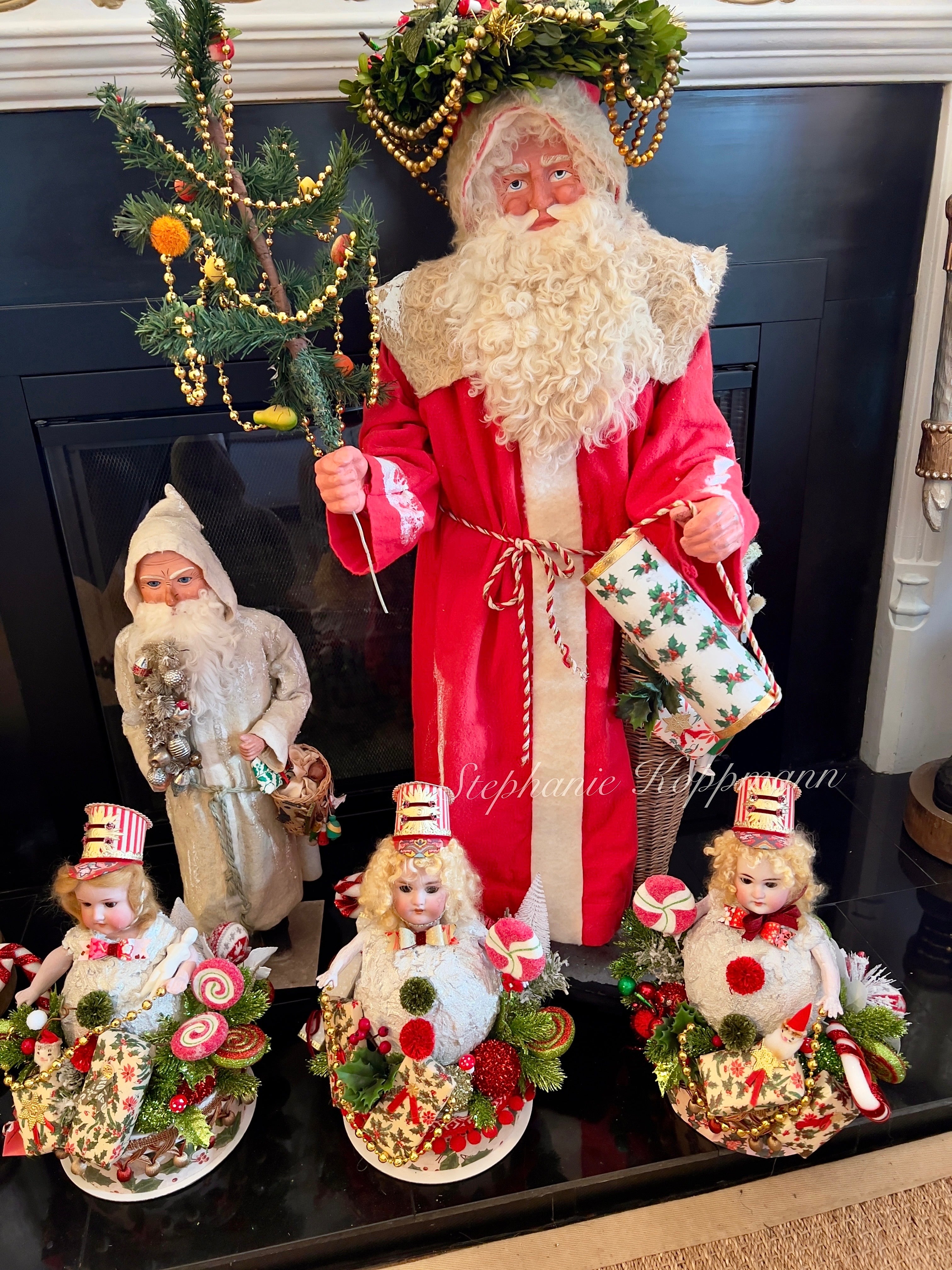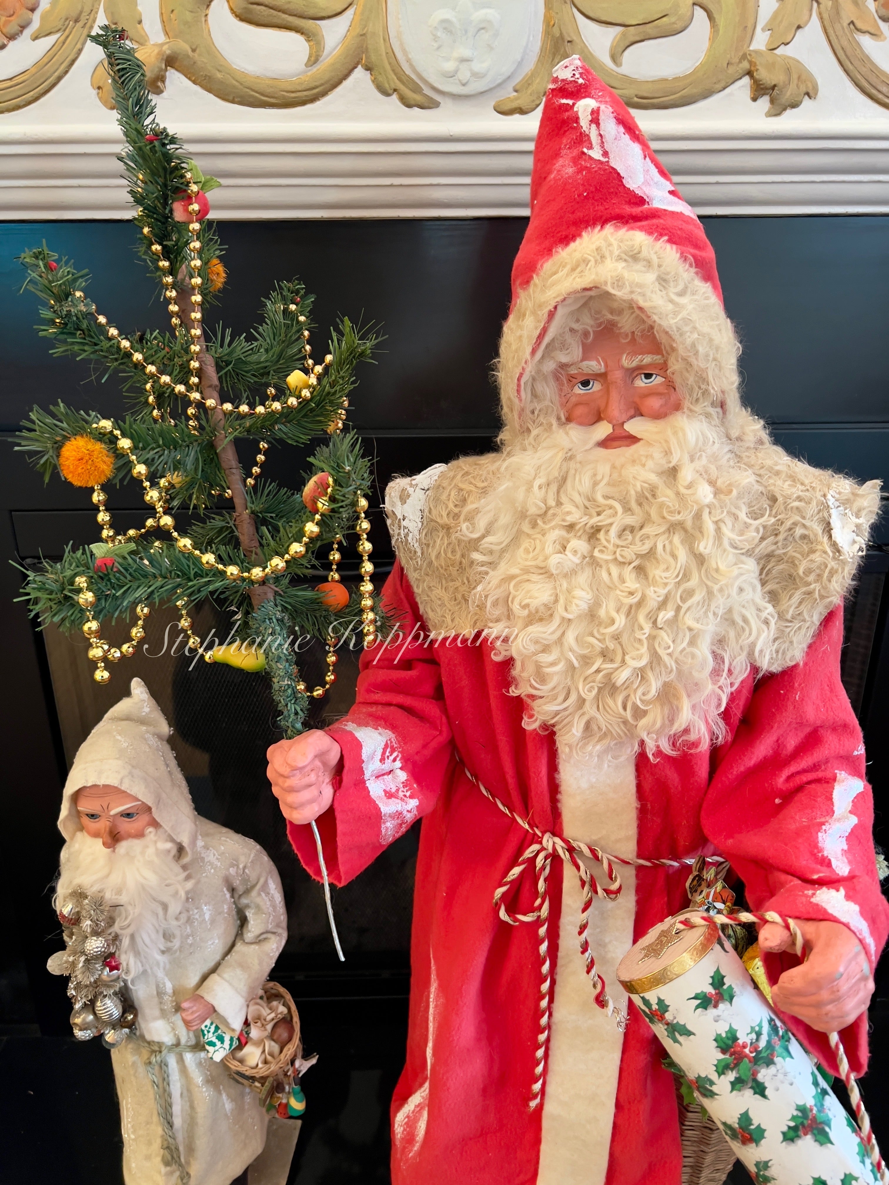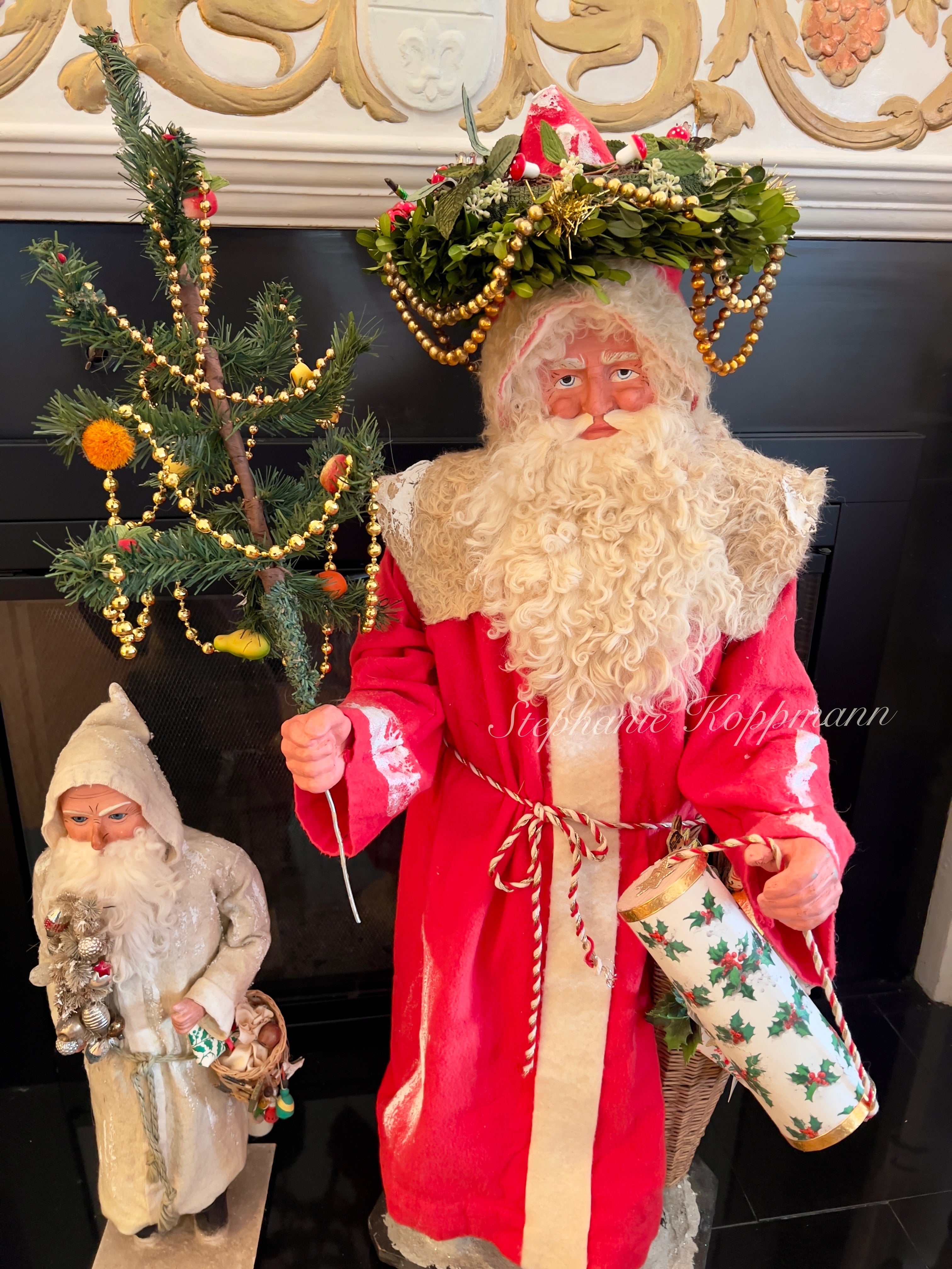 This impressive Santa figure stands 43 inches tall and is created using antique German molds. Crafted with meticulous attention to detail, his hands and face are replicas of a rare circa 1900 German Santa originally made in Sonneberg, Germany. The Santa's features have been meticulously molded and hand-painted to closely resemble the original, including remarkably realistic eyes. He is adorned in a stunning snow-glittered German Mohair shawl and red hand-dyed flannel attire. The accompanying feather tree is embellished with beaded garlands and real Marzipan fruit (please keep away from animals). The Santa carries a large cone reeded basket overflowing with antique and vintage toys, as well as wrapped packages. The doll included is antique and original to the card. Additionally, there is a handmade valise candy container fashioned from antique holly paper. Santa is securely mounted on a solid, heavy wood oak stand that has been treated to look authentically aged with a thick layer of German glass covering. His distinctive sheep's wool beard adds to his charm. The set also includes a handcrafted boxwood advent wreath, adorned with real antique German gold mercury glass garland double looped and genuine German candle bases. The wreath measures around 11-12 inches in circumference and is a valuable addition on its own, typically selling for $300.00 separately. This signed display is truly impressive and promises to captivate for years to come!