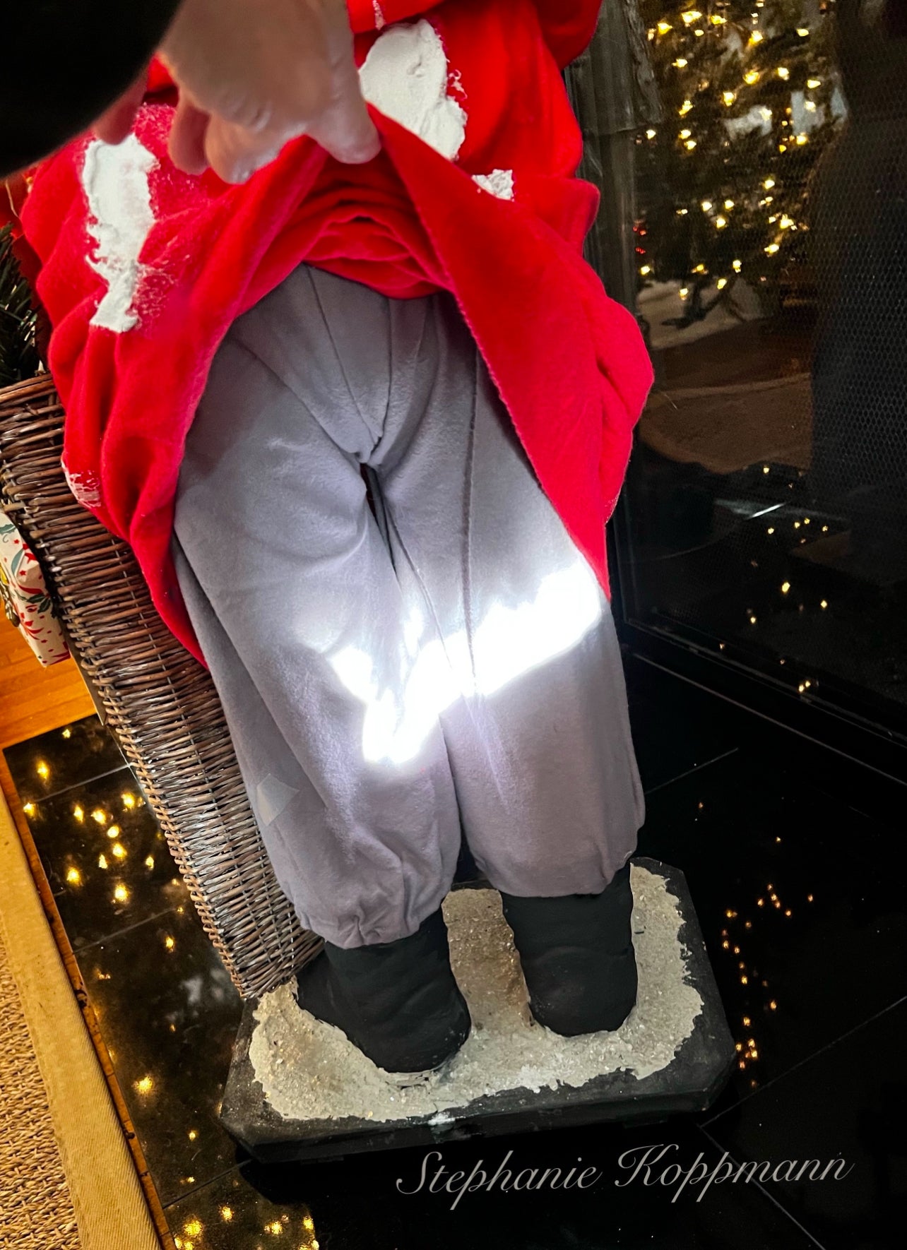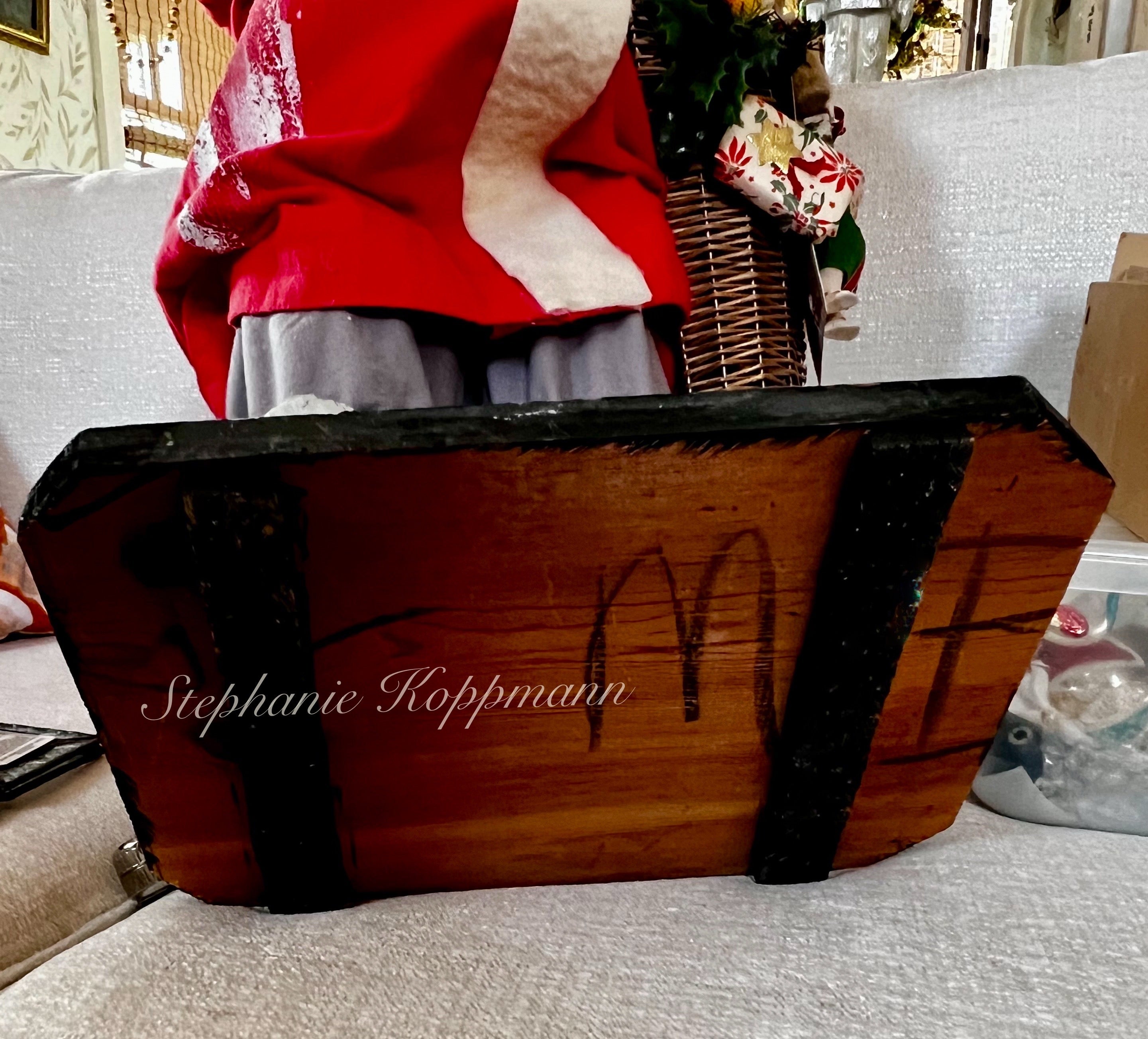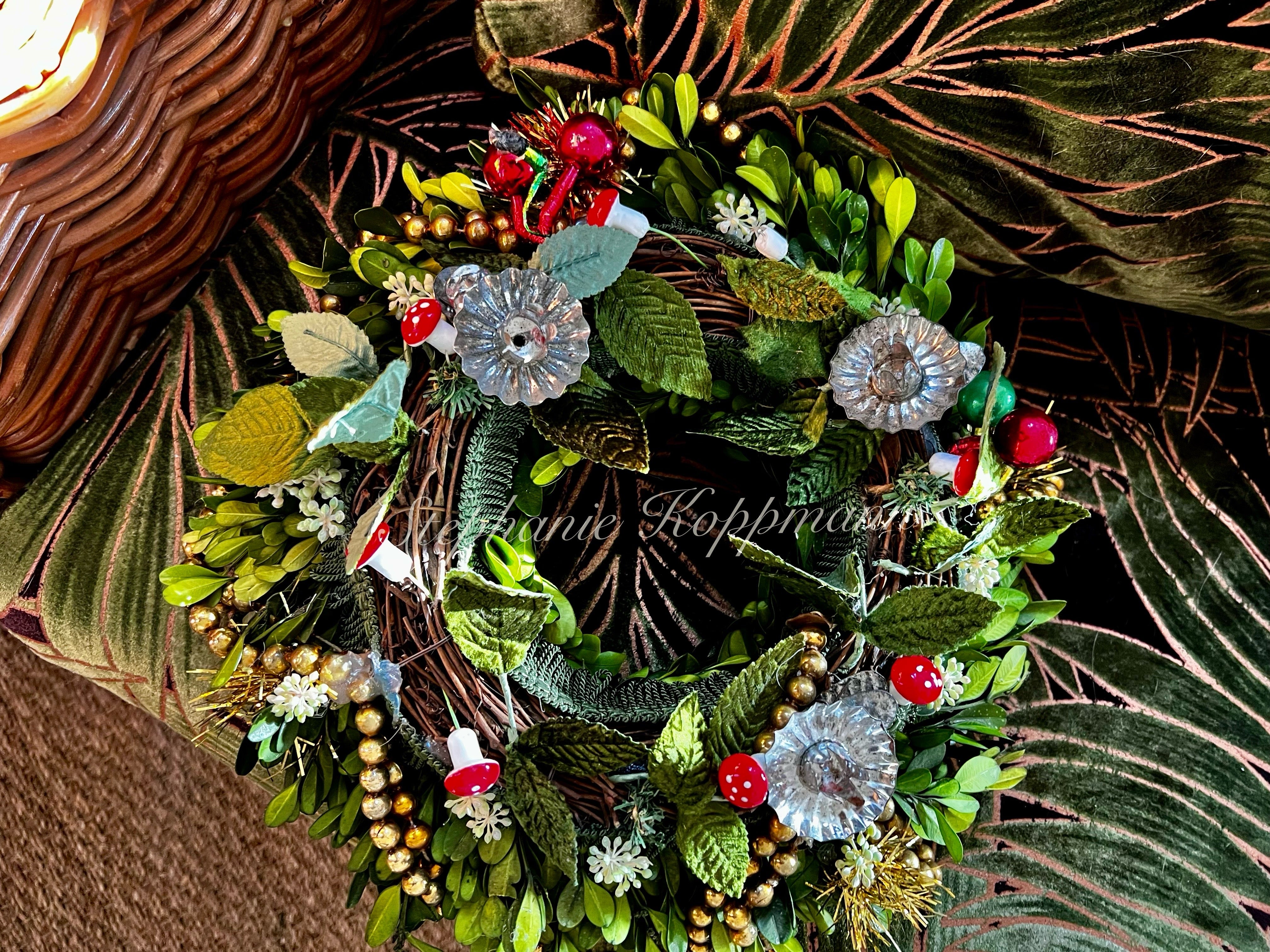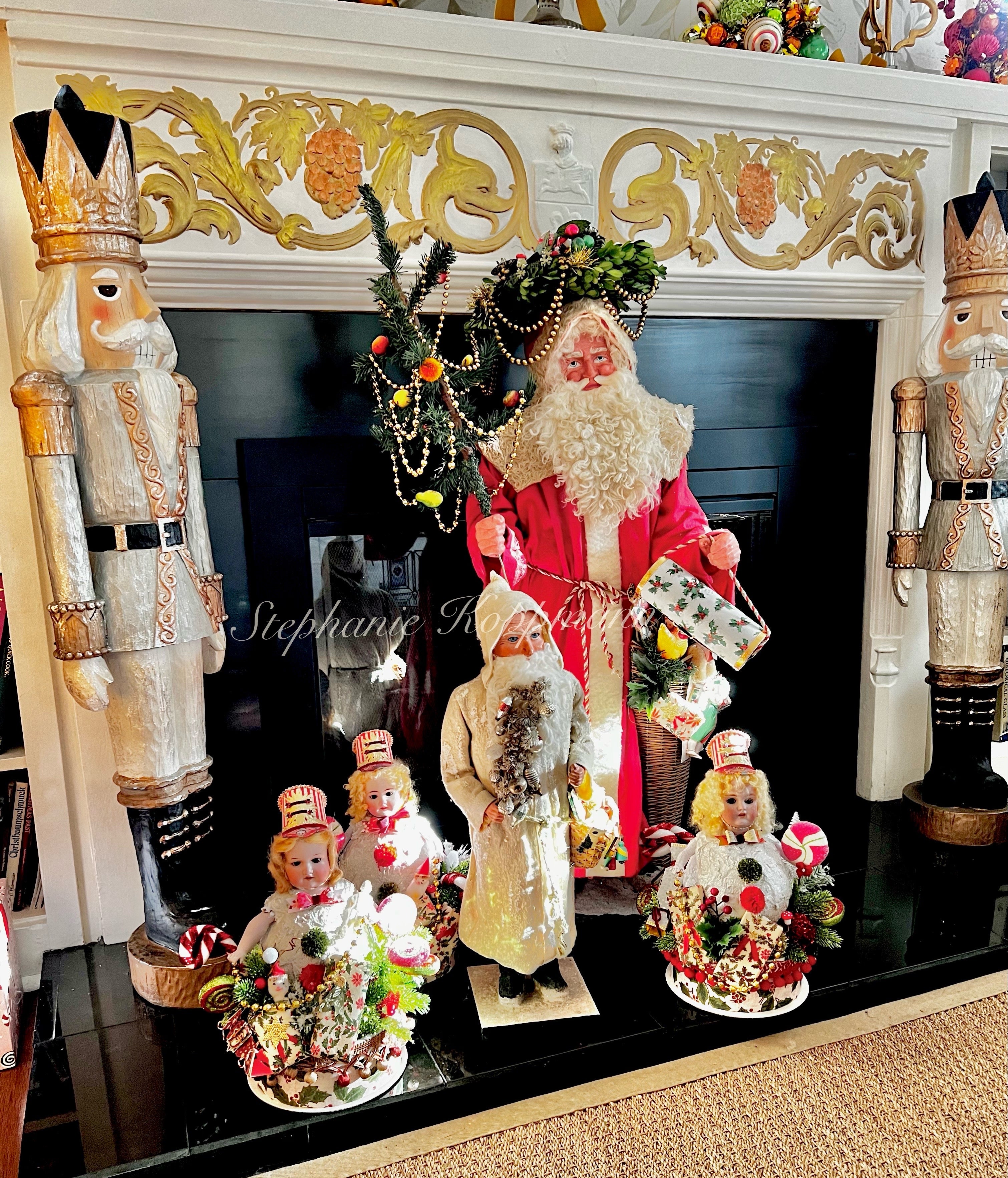 This impressive Santa figure stands 43 inches tall and is created using antique German molds. Crafted with meticulous attention to detail, his hands and face are replicas of a rare circa 1900 German Santa originally made in Sonneberg, Germany. The Santa's features have been meticulously molded and hand-painted to closely resemble the original, including remarkably realistic eyes. He is adorned in a stunning snow-glittered German Mohair shawl and red hand-dyed flannel attire. The accompanying feather tree is embellished with beaded garlands and real Marzipan fruit (please keep away from animals). The Santa carries a large cone reeded basket overflowing with antique and vintage toys, as well as wrapped packages. The doll included is antique and original to the card. Additionally, there is a handmade valise candy container fashioned from antique holly paper. Santa is securely mounted on a solid, heavy wood oak stand that has been treated to look authentically aged with a thick layer of German glass covering. His distinctive sheep's wool beard adds to his charm. The set also includes a handcrafted boxwood advent wreath, adorned with real antique German gold mercury glass garland double looped and genuine German candle bases. The wreath measures around 11-12 inches in circumference and is a valuable addition on its own, typically selling for $300.00 separately. This signed display is truly impressive and promises to captivate for years to come!
