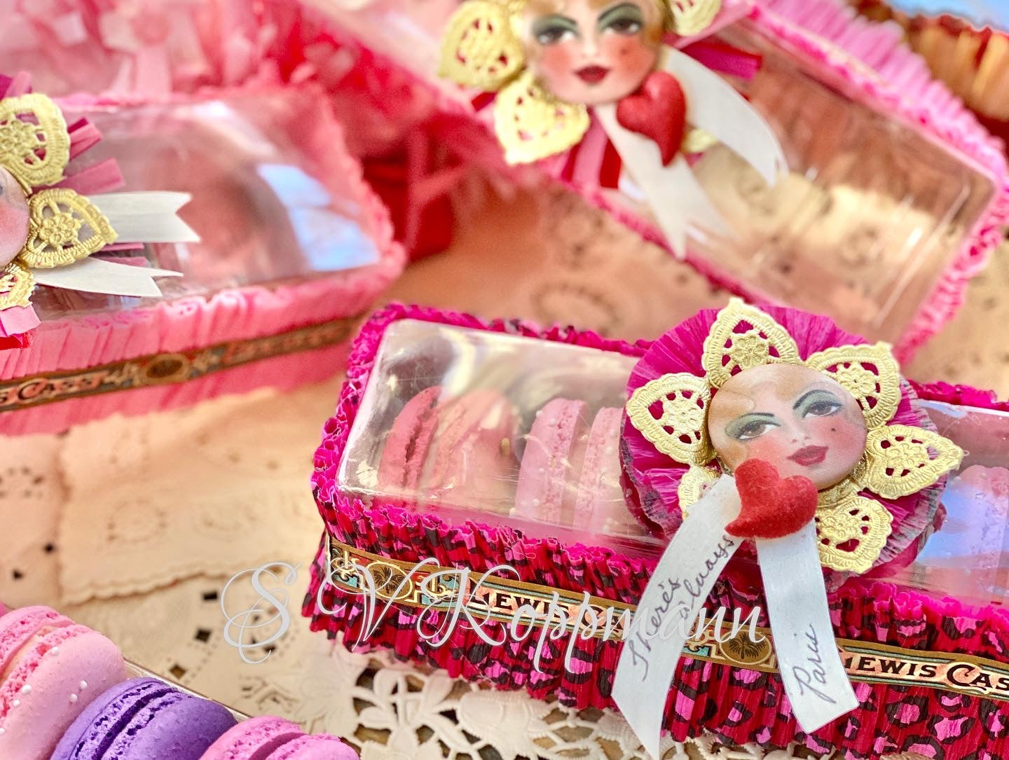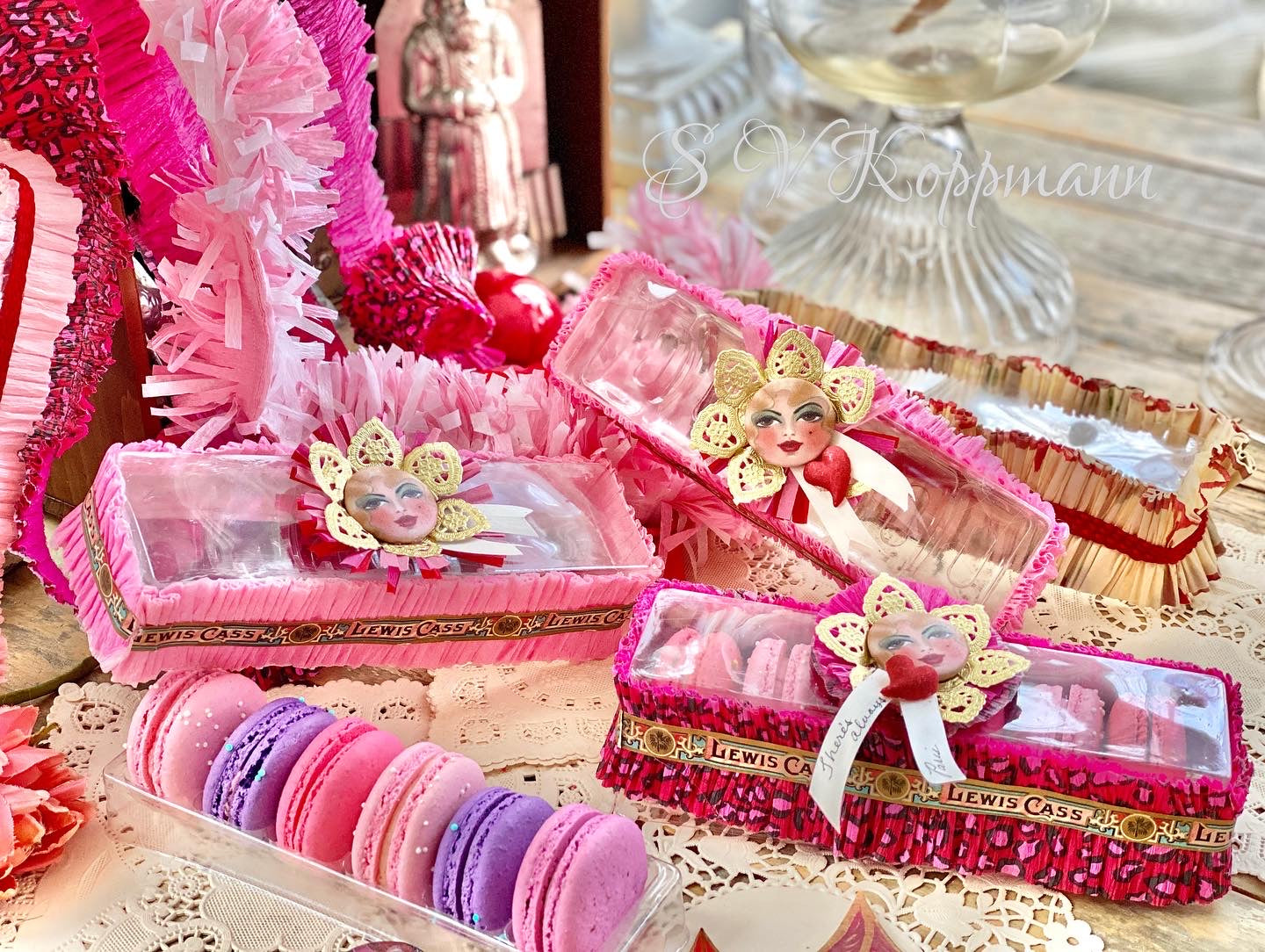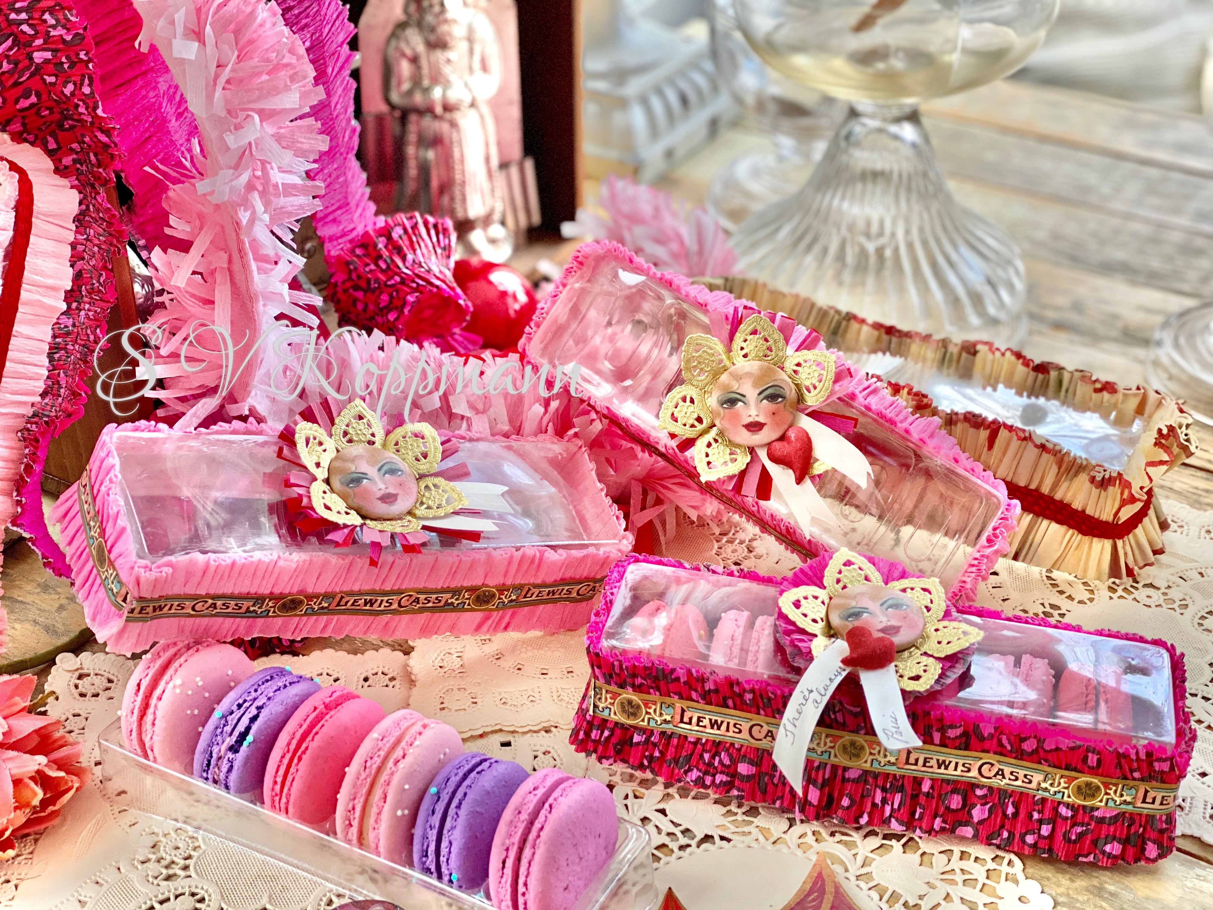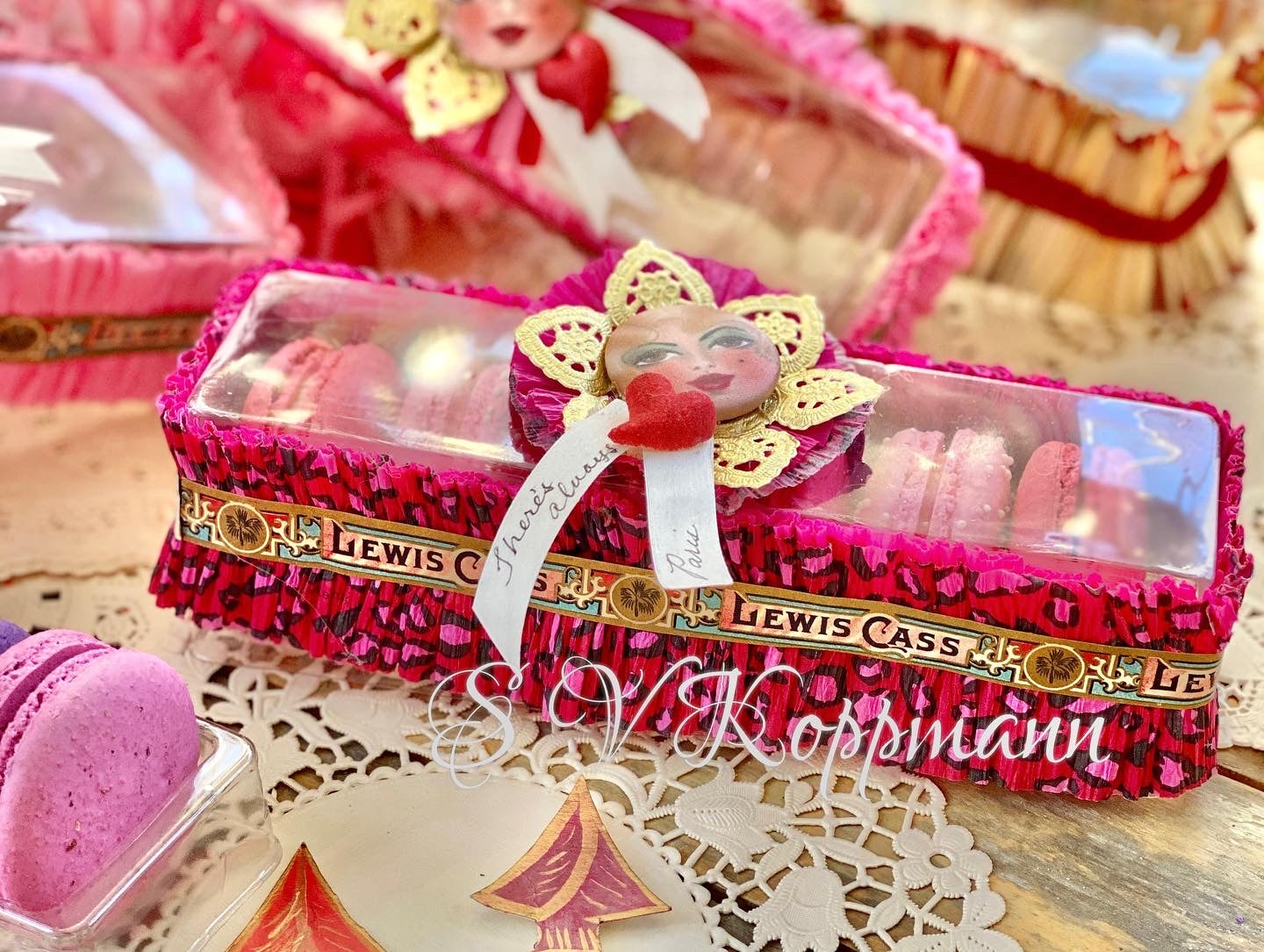 these darling festive macaron candy boxes. Decorated with tones of pinks, crepe festooning, vintage label trimmings and one of a kind French Flapper girl center stage. Flapper girl is completely handpainted and imported from Russia. 9”. Box only and boxes vary slightly. Two styles offered. Pink festooning or Leopard pattern festooning. Choose at checkout. *Cookies not included