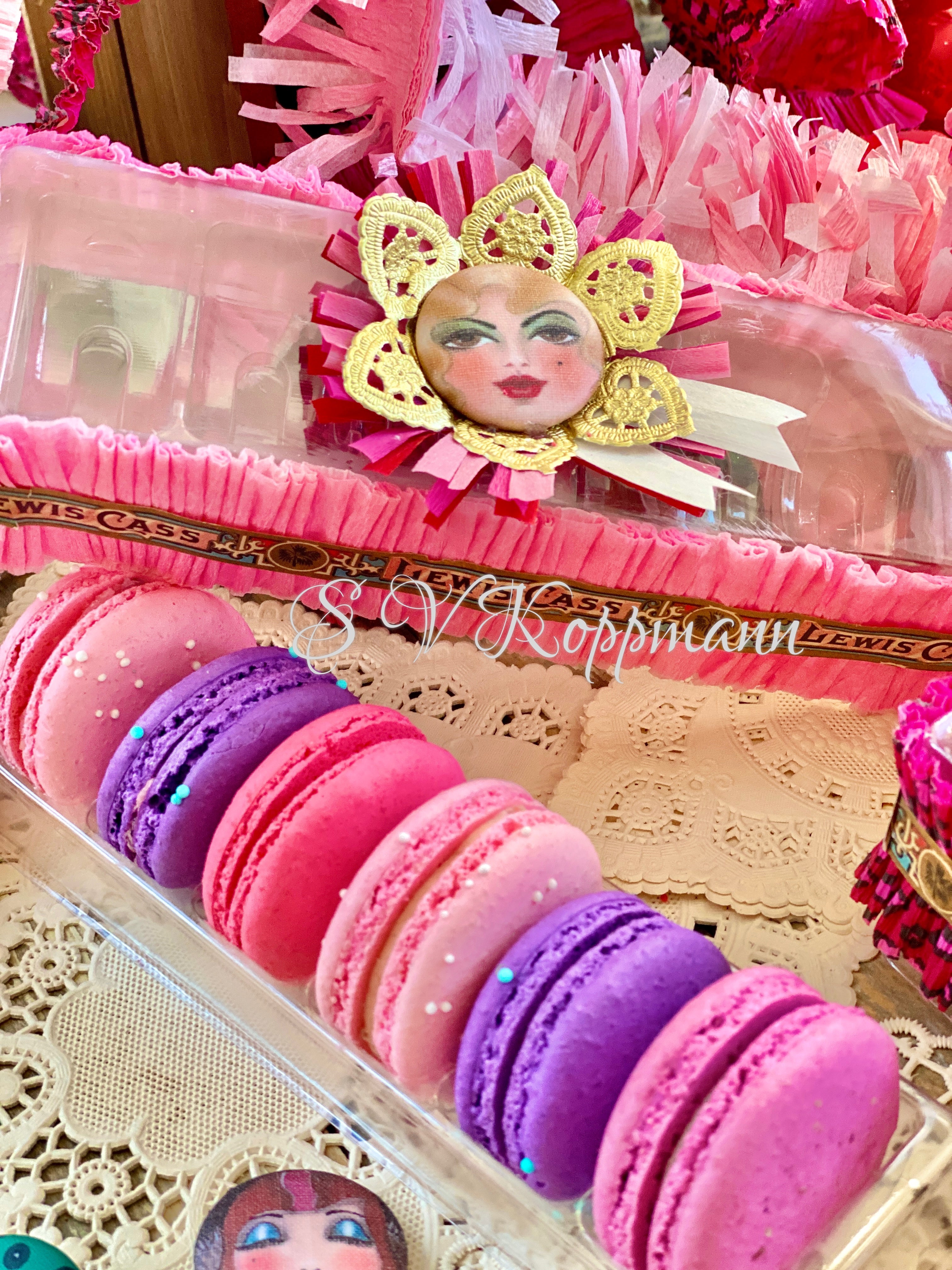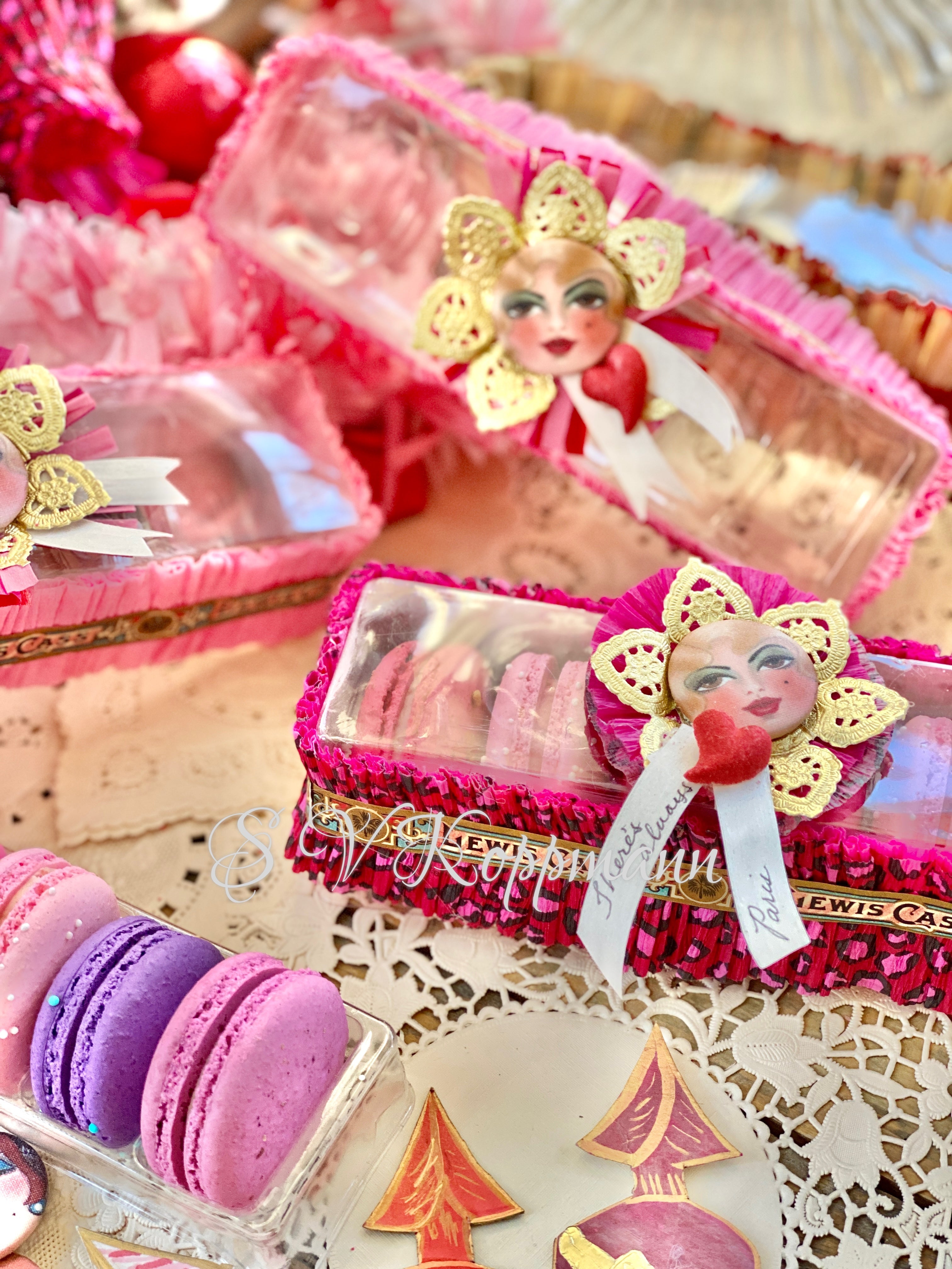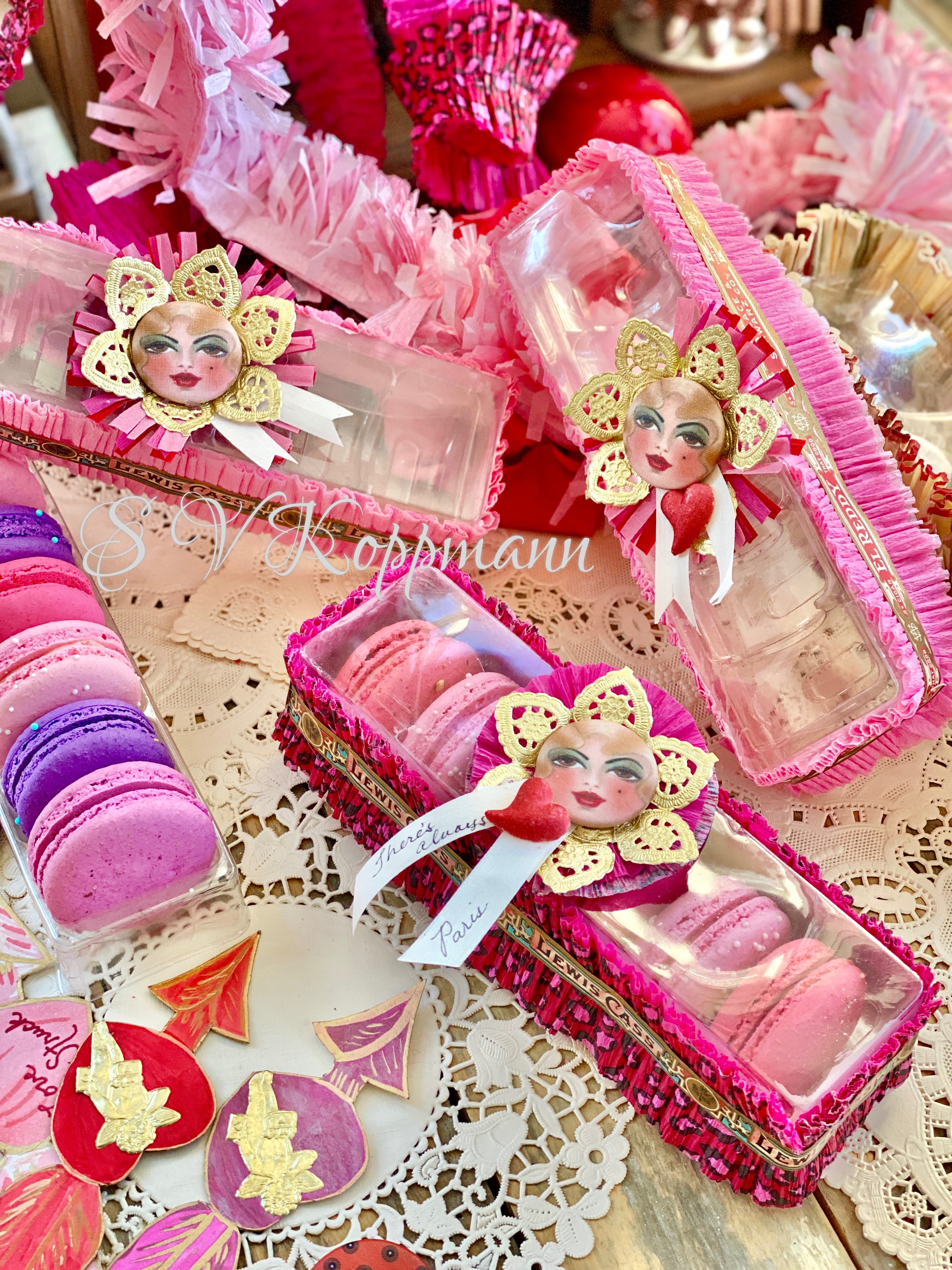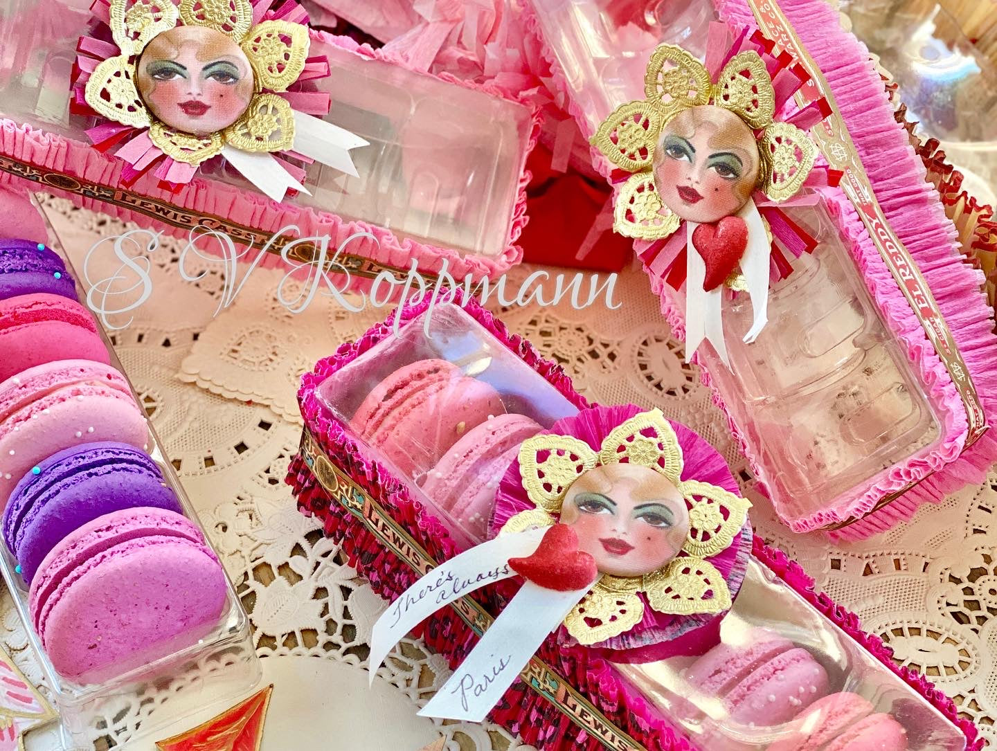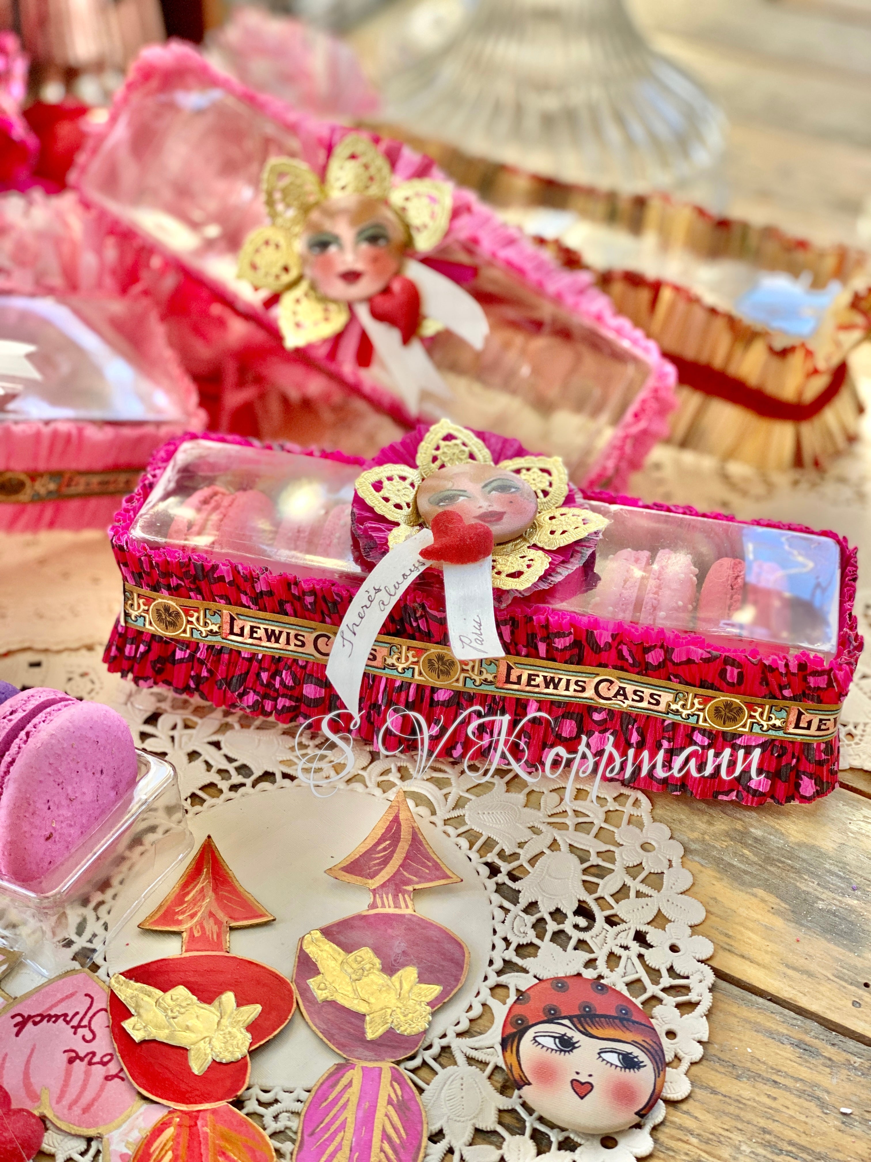 these darling festive macaron candy boxes. Decorated with tones of pinks, crepe festooning, vintage label trimmings and one of a kind French Flapper girl center stage. Flapper girl is completely handpainted and imported from Russia. 9”. Box only and boxes vary slightly. Two styles offered. Pink festooning or Leopard pattern festooning. Choose at checkout. *Cookies not included