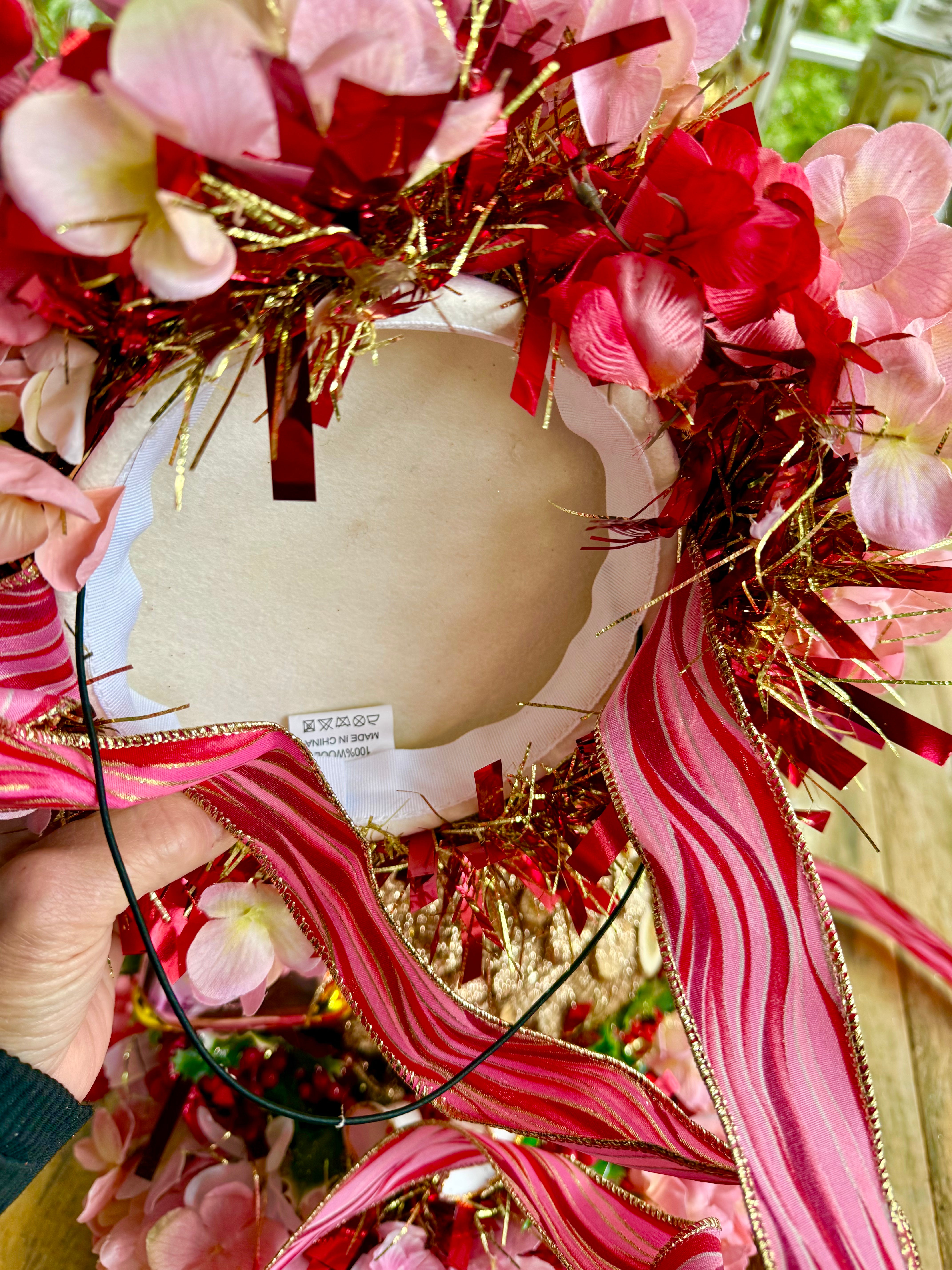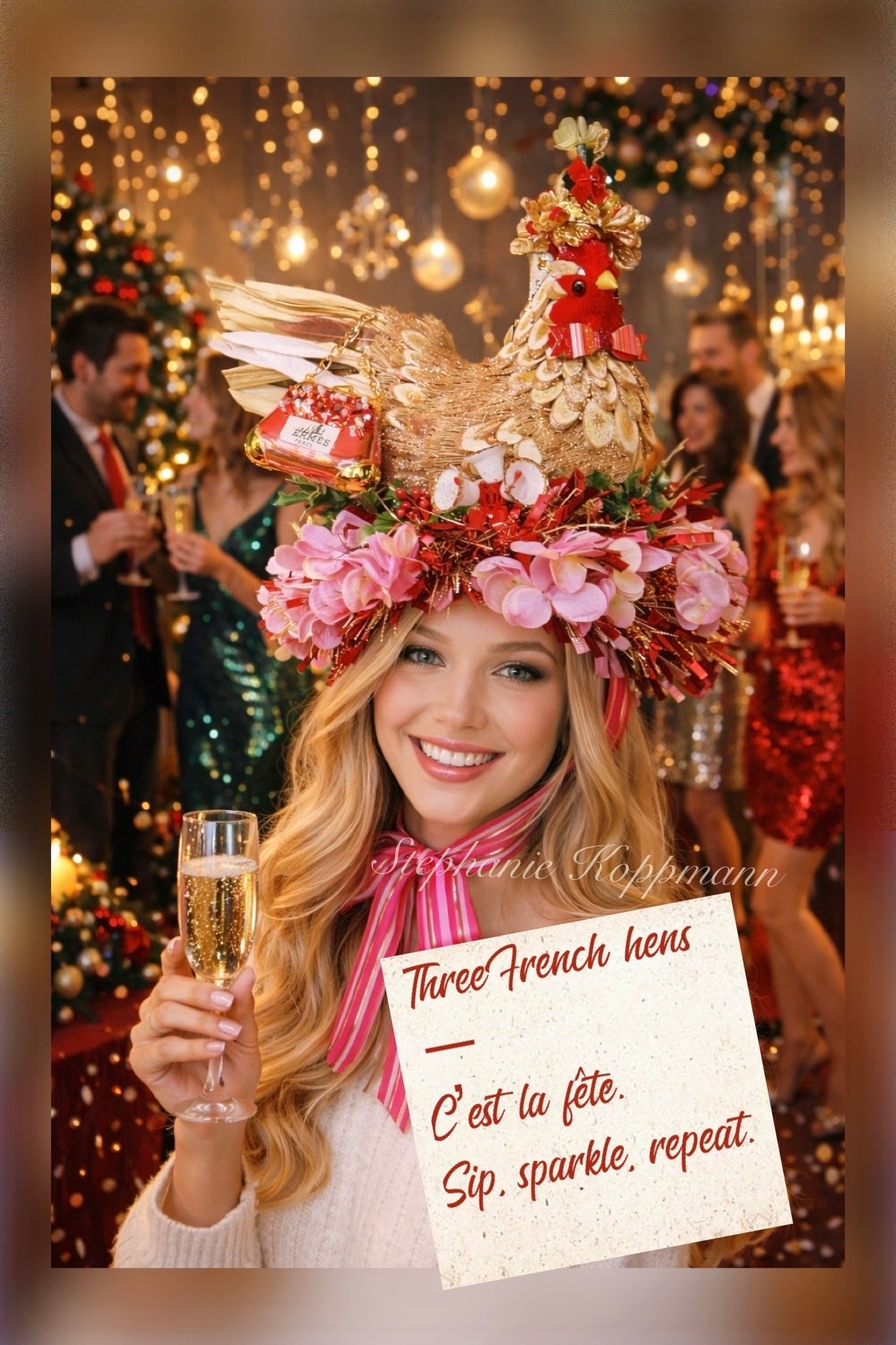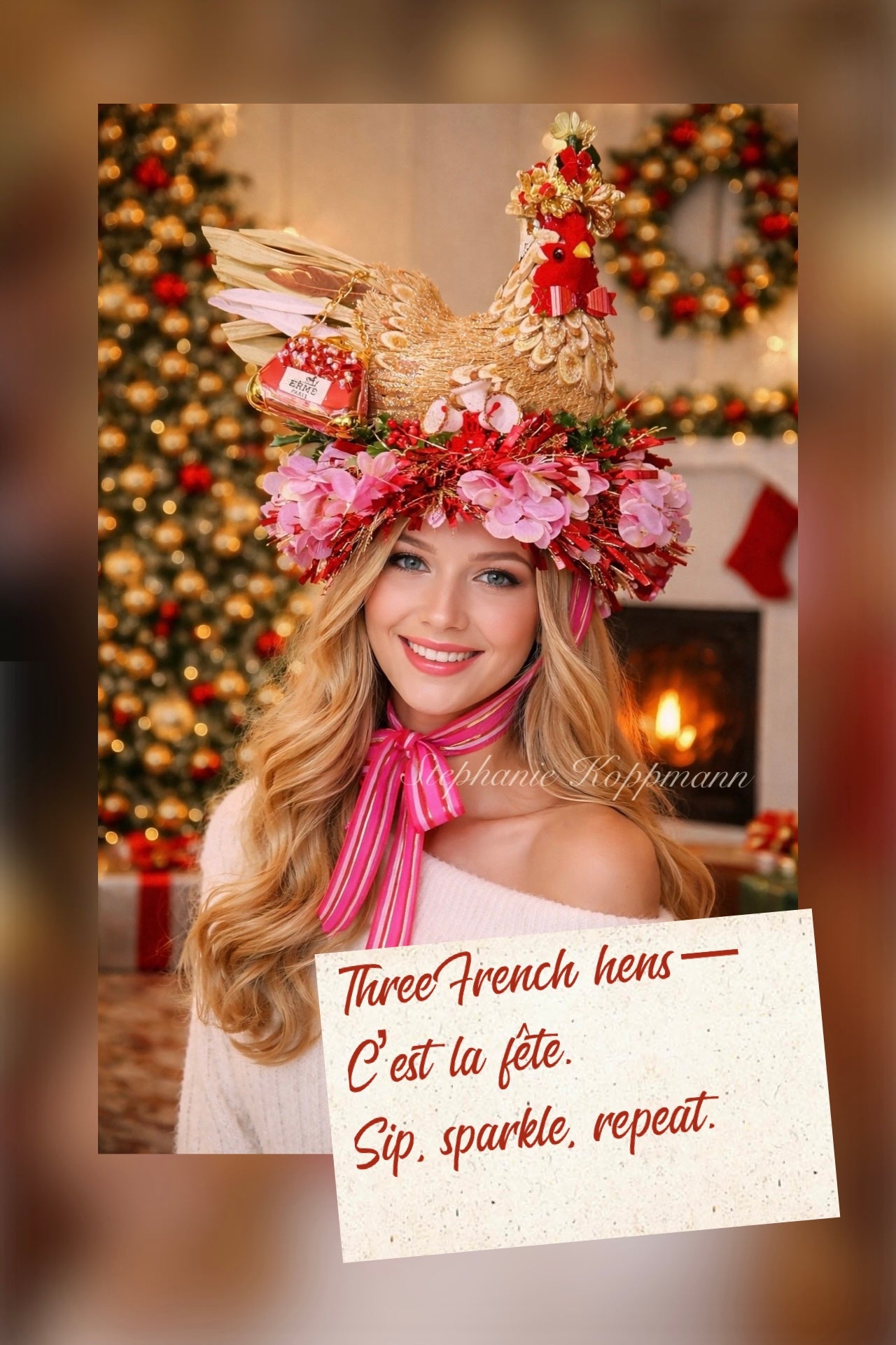 One hen per hat per order. These whimsical straw hens are imported from England and are crowned in hand-assembled French crowns and nestled into lush silk hydrangea, festive Christmas tinsel, and millinery greenery. Each hat features a charming glass purse ornament for a playful touch of holiday French glamour.