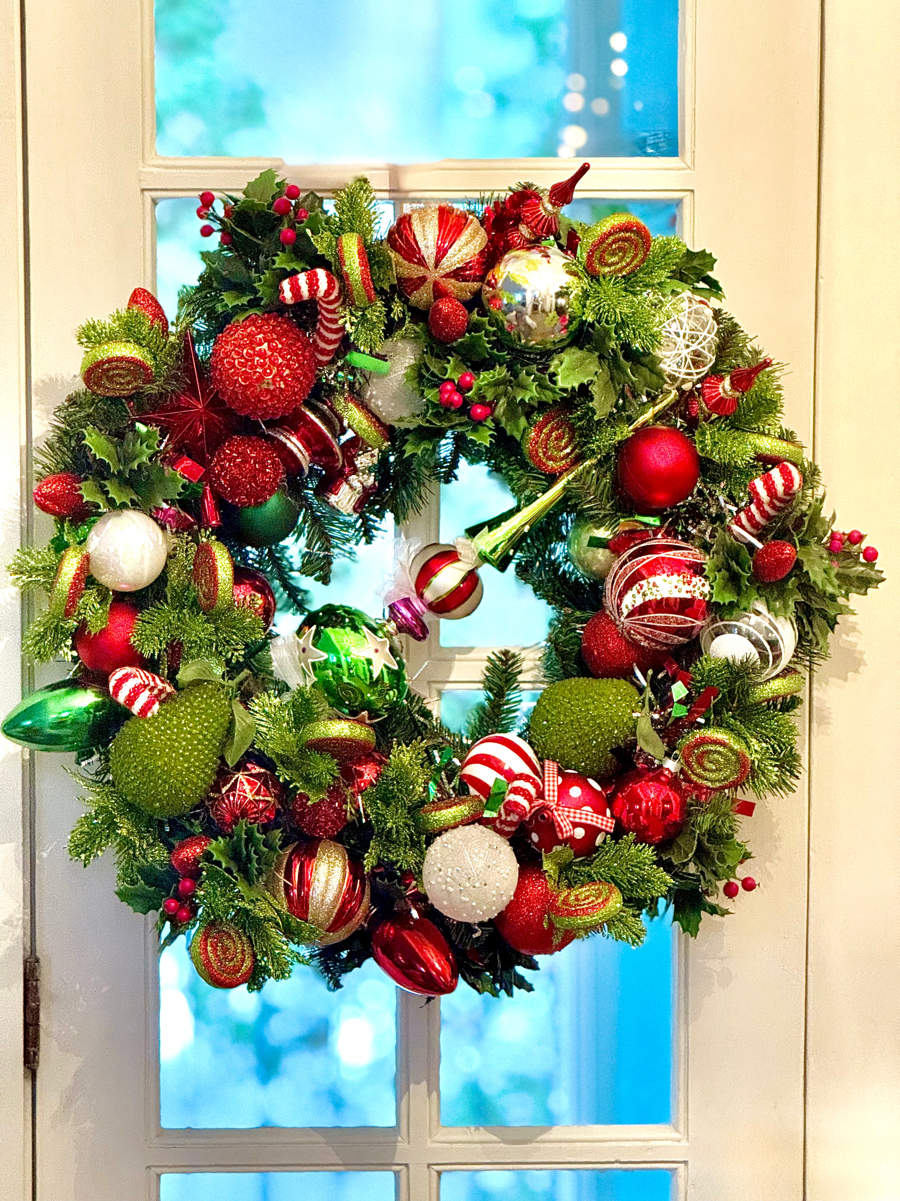 22” traditional Christmas Fir Wreath. Reds, vibrant greens and candy cane decor. Glass central topper takes center stage. Sparkly. Kitschy and sure to bring good cheer. free shipping in US only